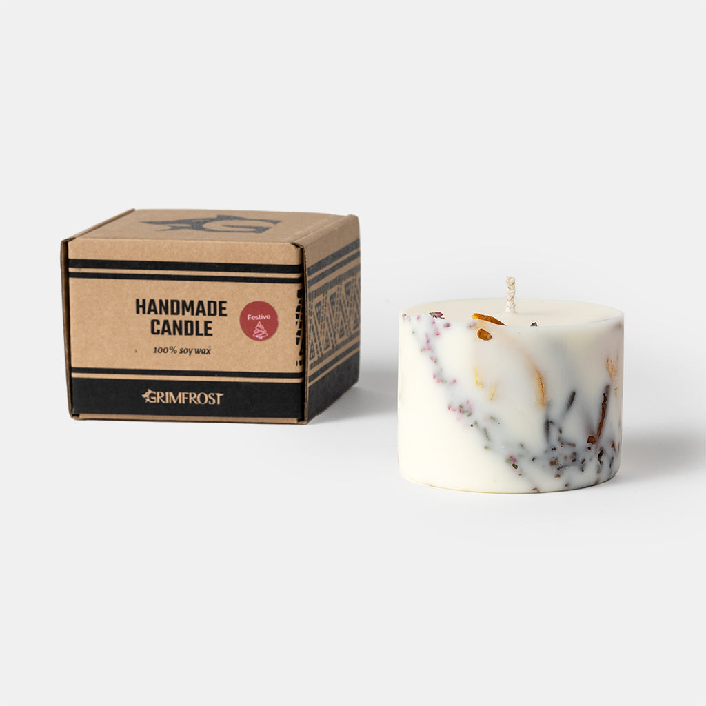 Beautiful wax candle handmade with 100% natural soy wax, cotton wick and natural decors from Baltic forests and meadows. The readily giftable package is made from high quality, plastic-free kraft cardboard. It is printed using non-toxic inks and LED-UV green technology.