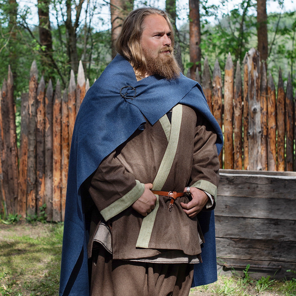Durable Viking Age cloak made from dense wool. Use it for looks, for protection from the elements, or to sleep in. The cloak can be embroidered or trimmed with tablet woven braid for a wealthier look.