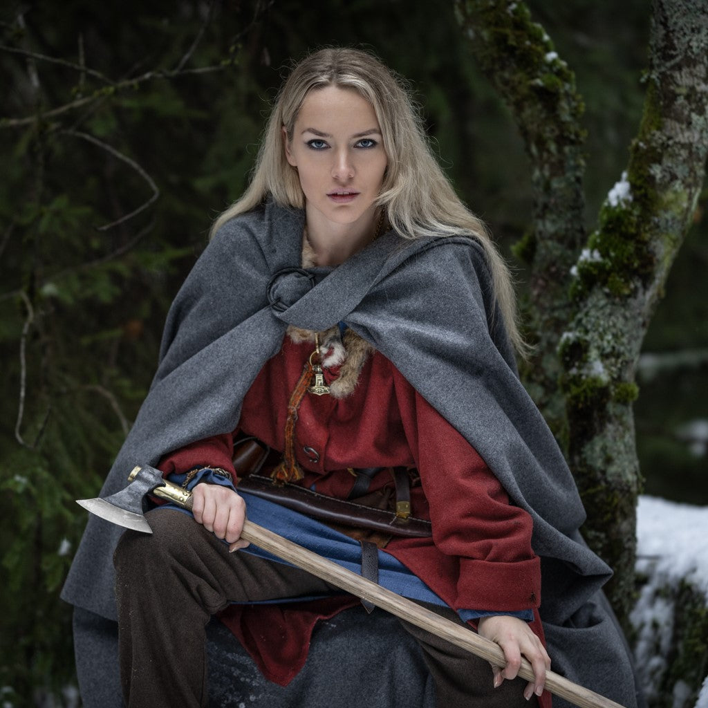 The Viking Age cloak consists of a large rectangular piece of wool that is meant to provide protection from the elements. Grave evidence and contemporary depictions suggest that cloaks were pinned on the right shoulder, leaving the right arm free. The left side that hangs down can be thrown over the shoulder to free the left arm (as seen in the pictures). The cloaks hung somewhere between the knee and the ankle.