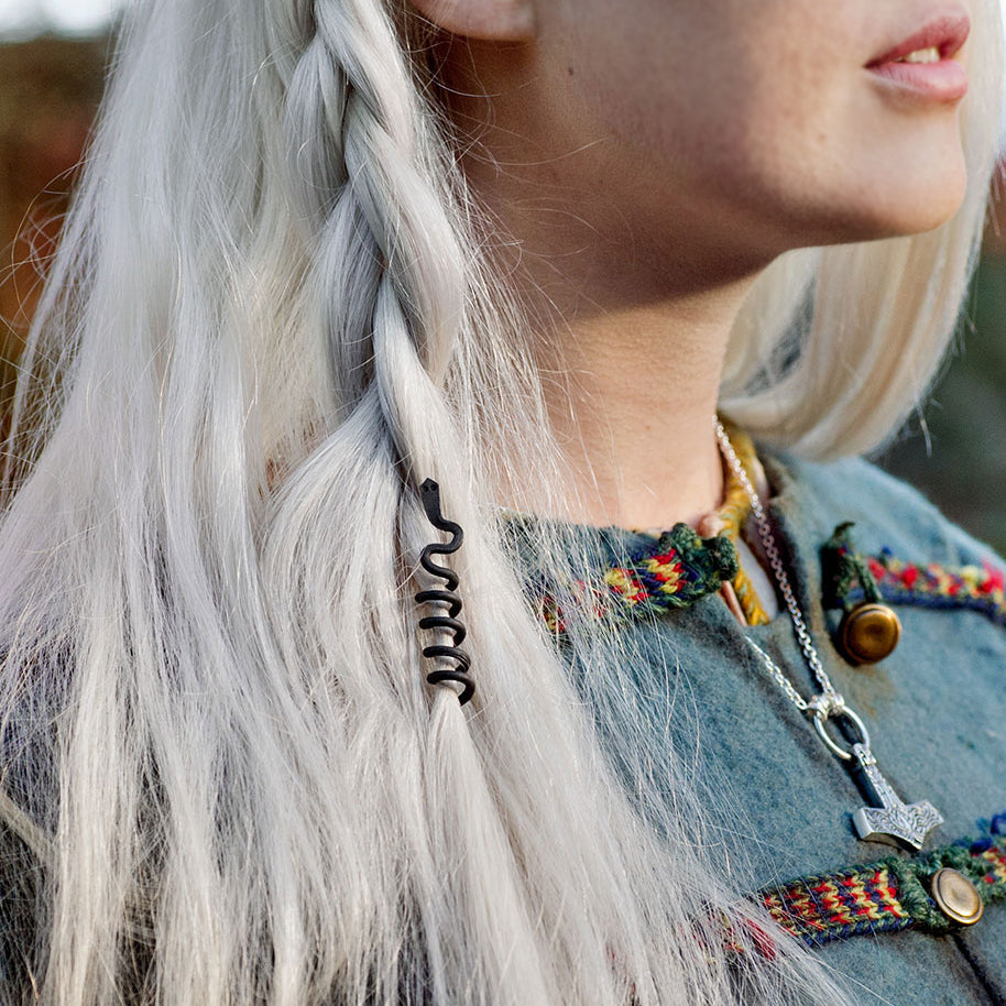 Hand-forged hair jewelry in the shape of Níðhöggr, a huge serpent in Norse Mythology. Use it in your hair to get a striking, Viking look.