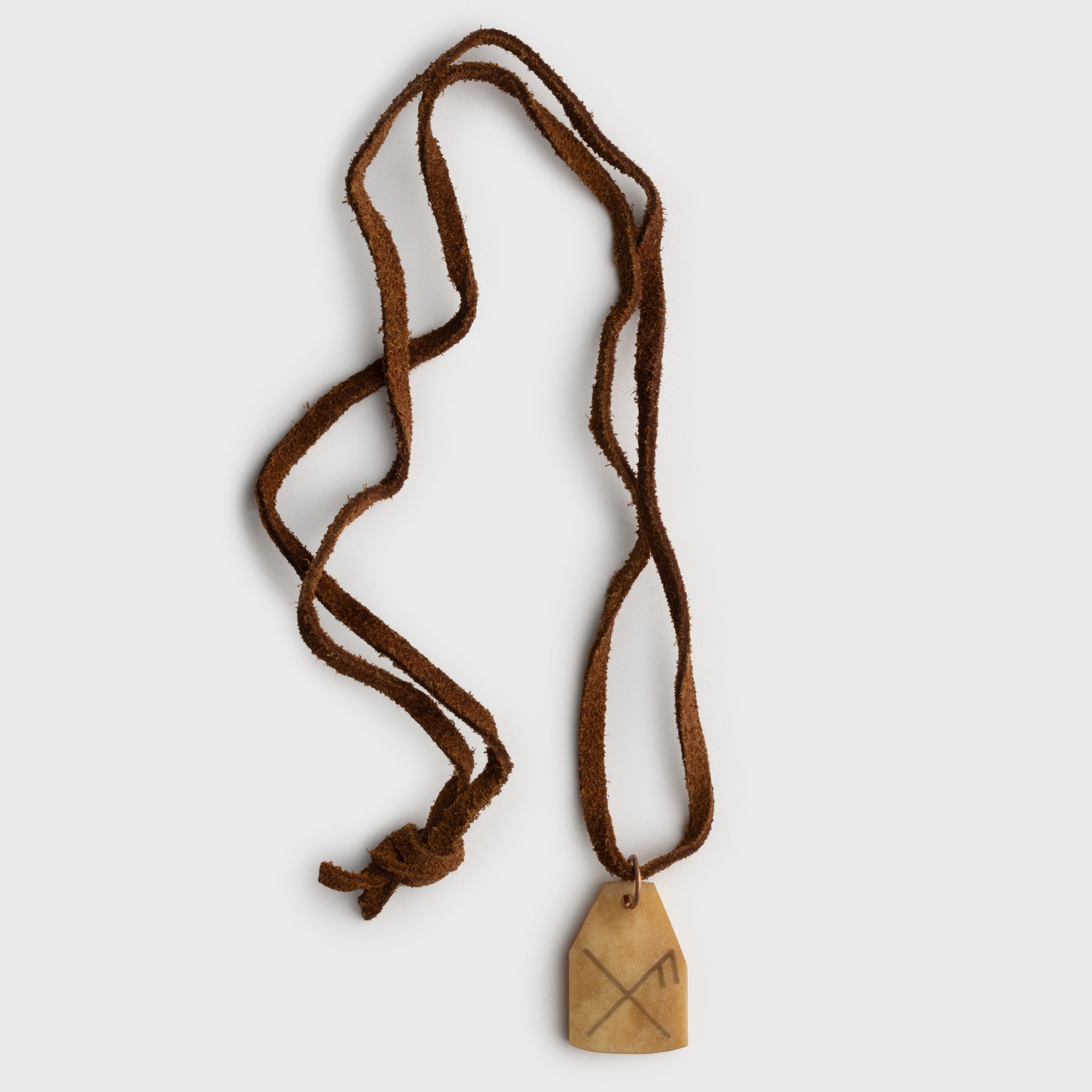Handmade bone amulet with a bindrune consisting of the Gebo (G) and Ansuz (A) Elder Futhark runes. It is a magical design representing the inscription "Gibu Auja", which is an old inscription found in archaeological finds from 6th Century Scandinavia translating to "I Give Luck".