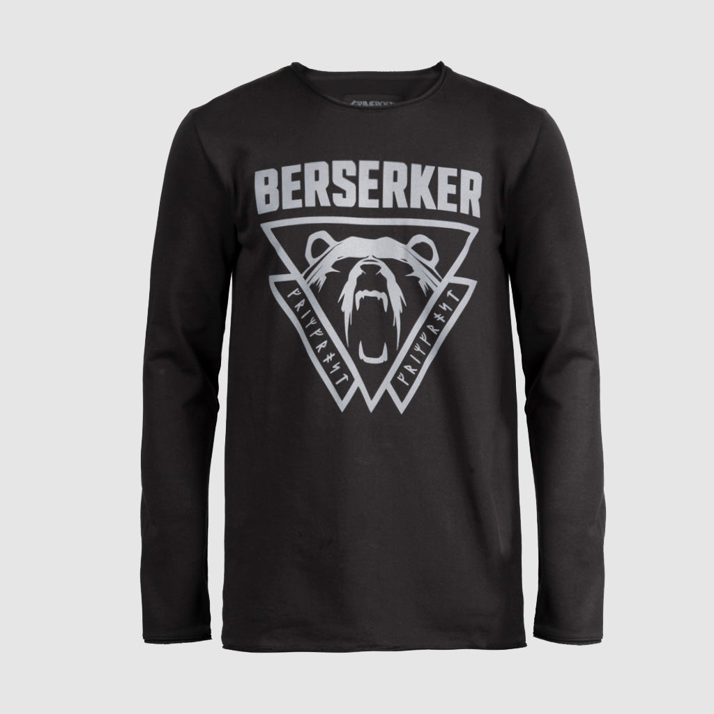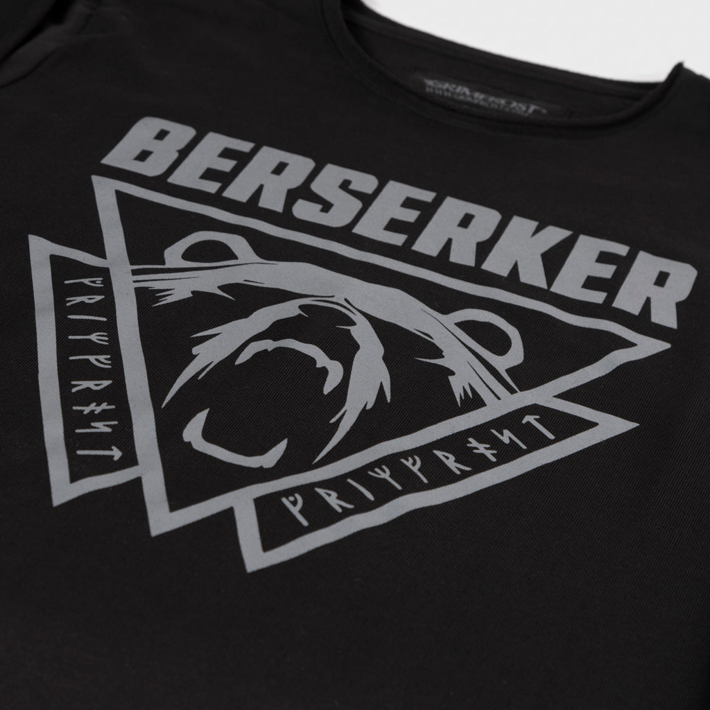 "Berserker", a Valknut triple-triangle and a roaring bear are printed on the front. The Valknut is a symbol of Odin, the god of the Berserker. The bear represents the state of mind of the raging Berserker.