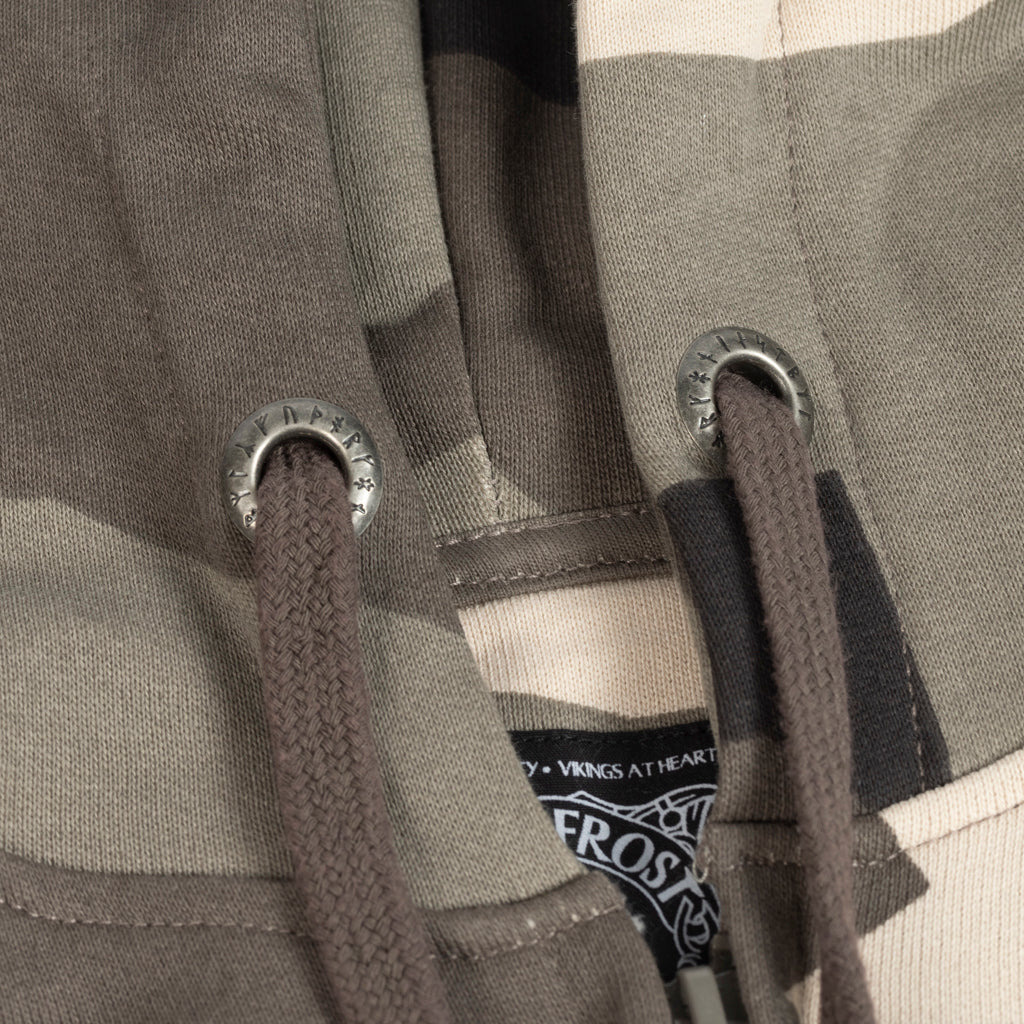 Premium full zip hoodie in the famous M90 camo pattern used by the Swedish Armed Forces. It is custom-made for Grimfrost in soft, luxurious organic cotton. Even the dyeing and printing processes are fully organic, which is good for both You and Mother Earth. The hoodie comes with a zipped utility pocket on the left arm and spacious kangaroo pouch pockets. To top things off, we have given the drawstring eyelets a Younger Futhark runic circle.