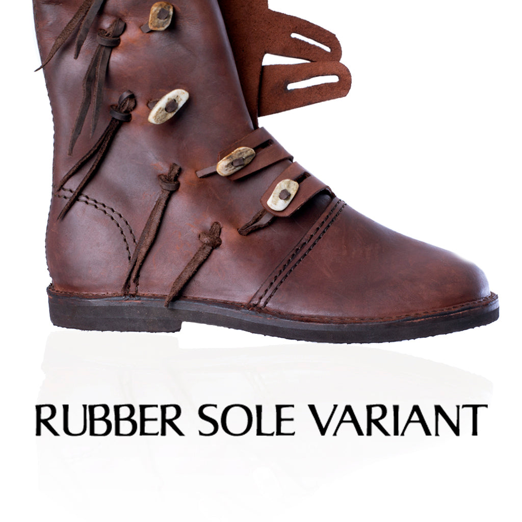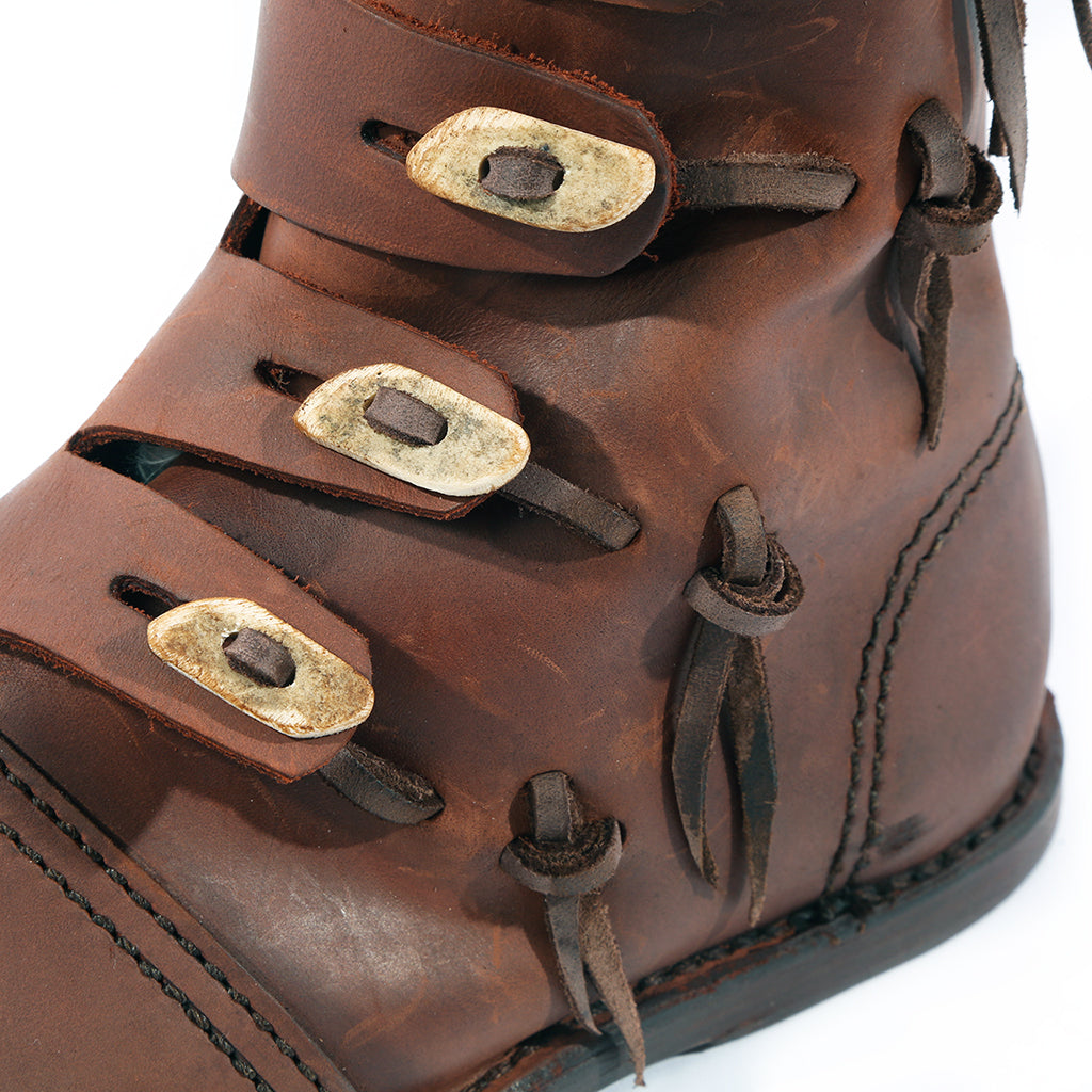 These boots are inspired by a find in Hedeby, Denmark, with the characteristic straps and antler toggles of the time. Viking Age shoes lasted only up to 6 months, so we’ve upgraded the boots with tough, thicker leather soles that can withstand a lot of wear an tear. There is also a rubber sole with heel alternative for those wanting maximum comfort and durability.