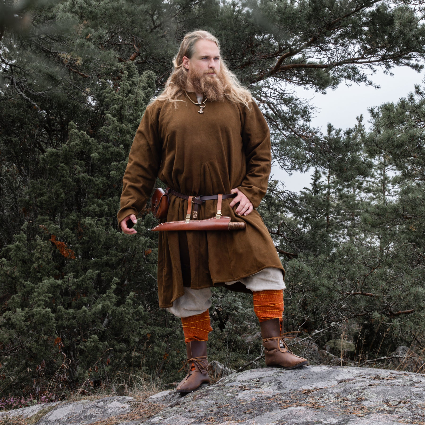 Comfortable kyrtill (overtunic) based on the wool garment found in Moselund Bog, Denmark, dated to circa 1100. Just like the original, it is made it 2/1 twill weave and comes with side gores that that reach all the way to the top of the back piece. The front and back gores are split up the center for horseback riding - a design called "blaðakyrtill" in old Icelandic texts.
