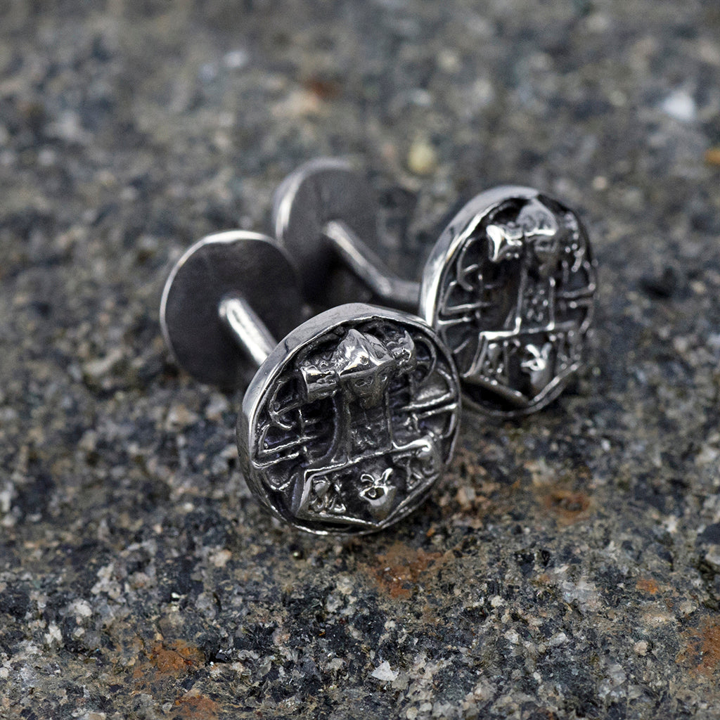Pair of cufflinks with a Mjolnir design. Combine them with the Mjolnir Disc Tie Bar.