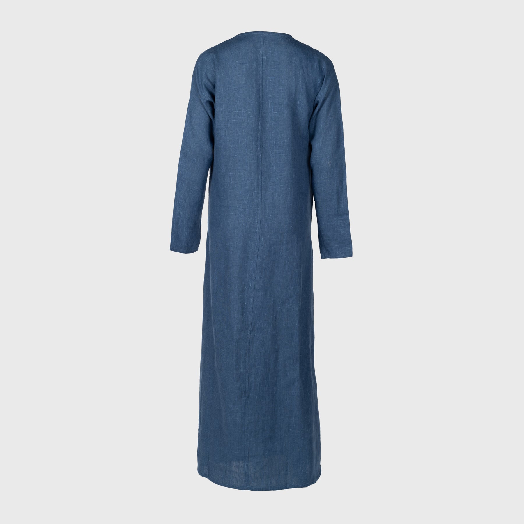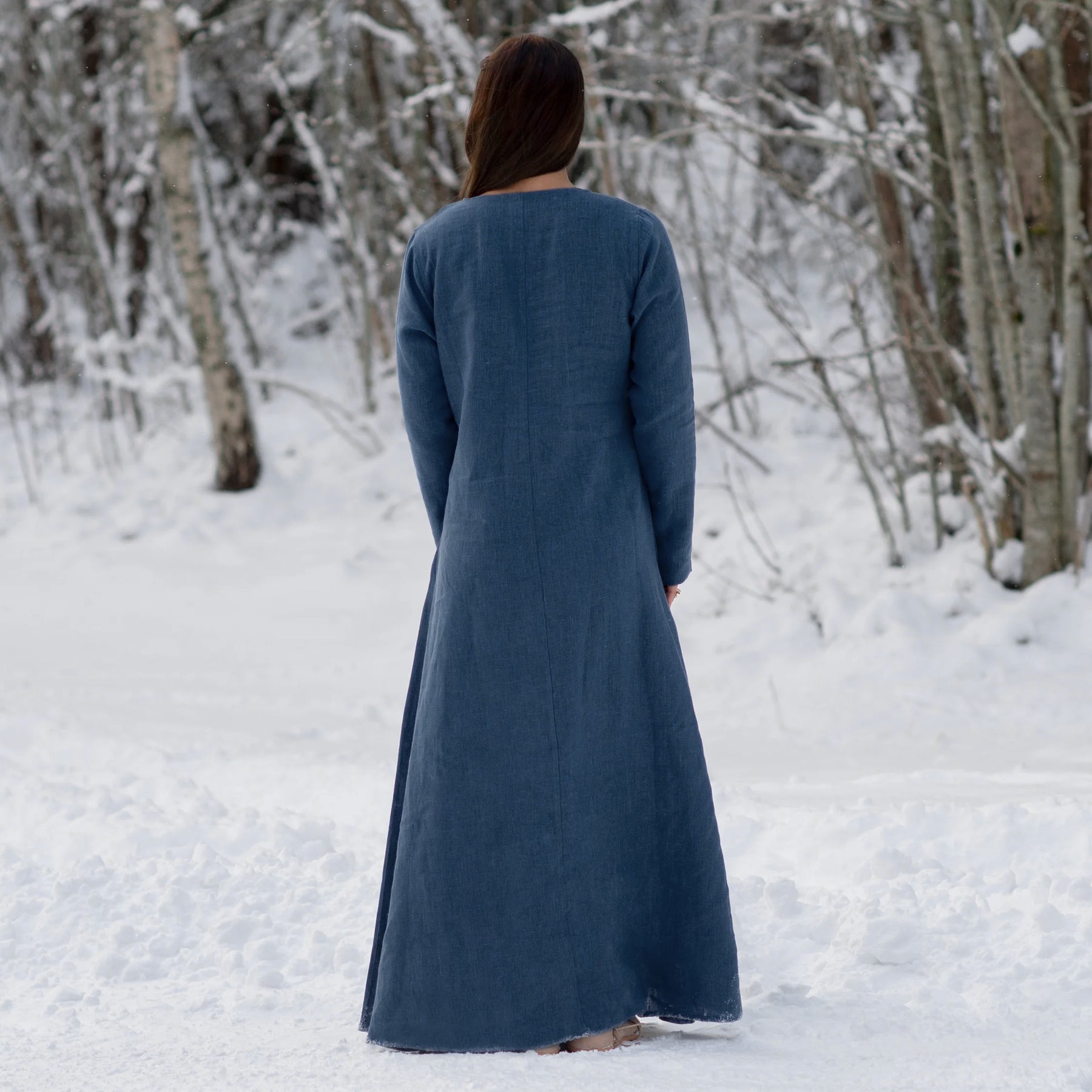A comfortable linen dress based on historical sources. Undyed linen dresses were worn by most women during the Viking Age - a blue one would have implied the wealth of the owner.