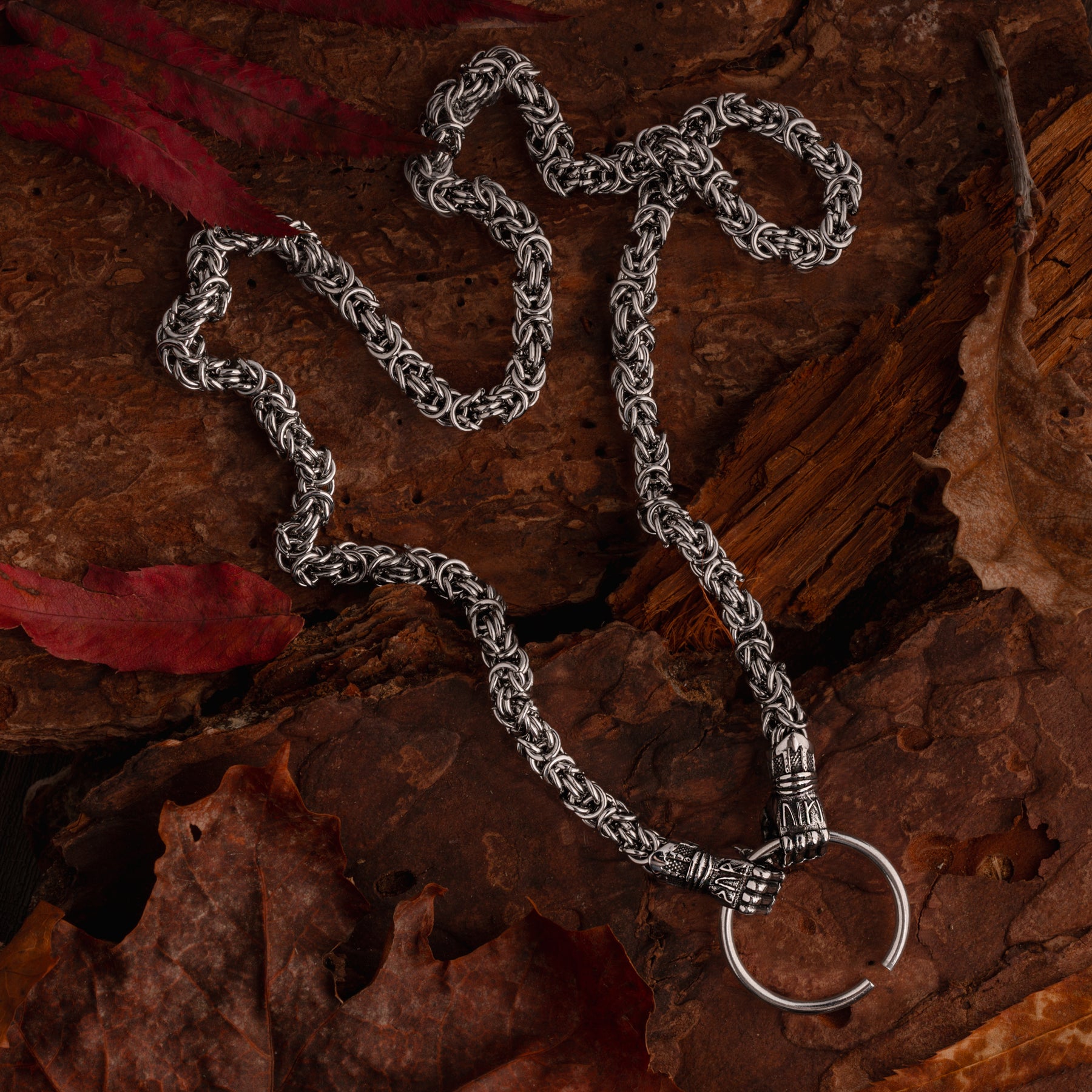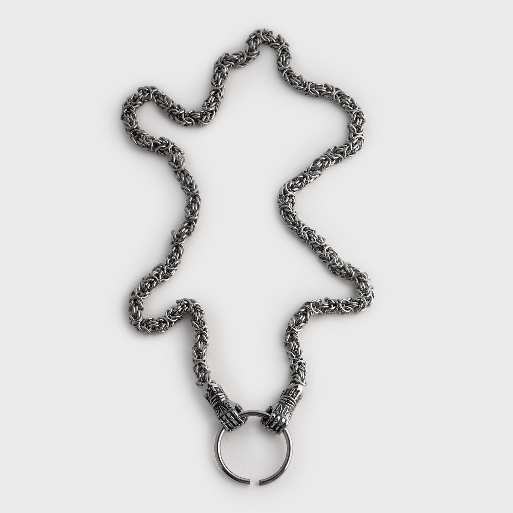 Vikings used necklaces with animals or beasts biting onto a ring where pendants were hung. This variant consists of a King Chain ending in Járngreipr, the iron gauntlets of Thor, that hold onto the pendant ring. The gauntlets have "THOR VIKI" written on them with runes, which translates to "Thor protect/bless". As the name implies, this is the king of all chains and it was seen as a sign of success and power among the Vikings.