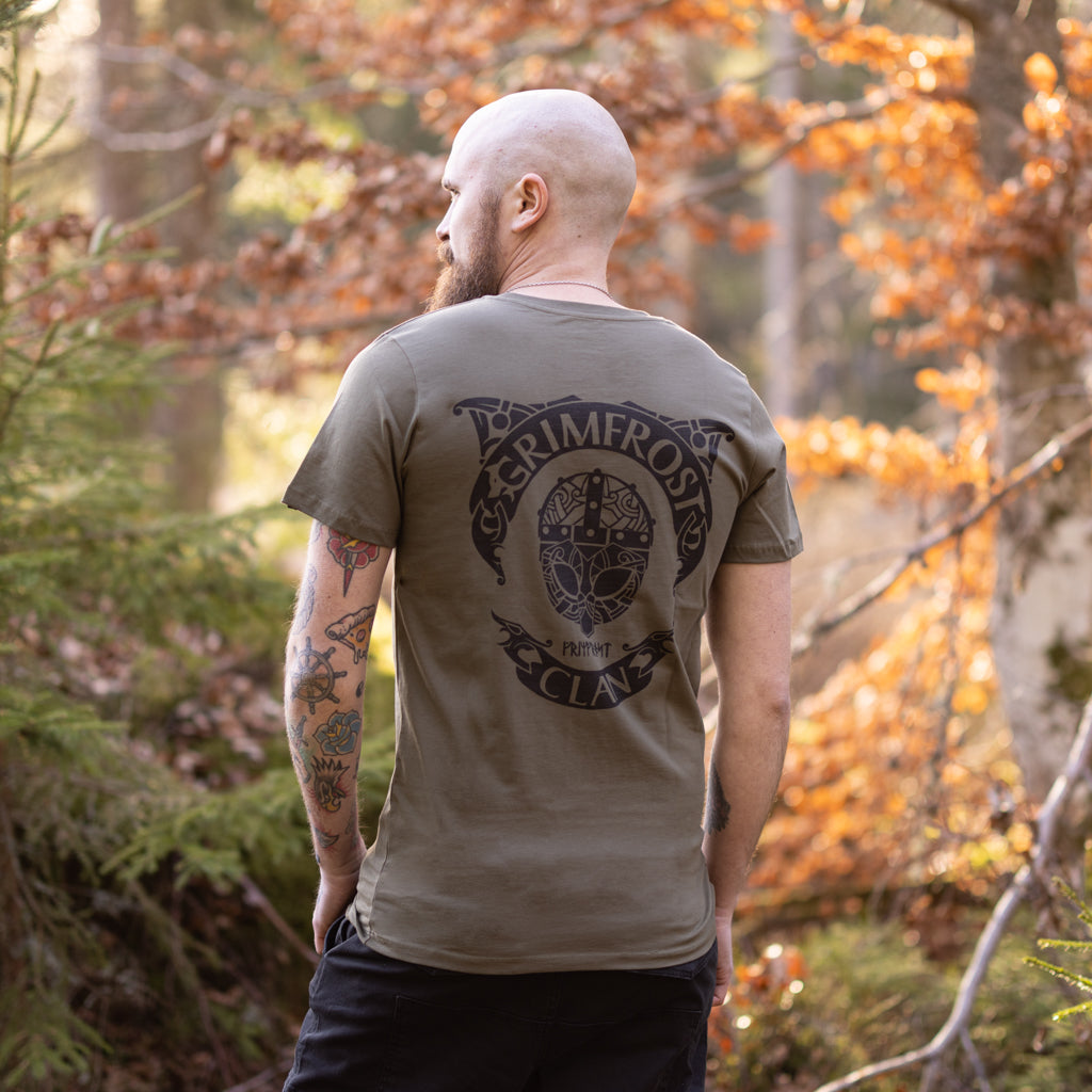 Premium T-shirt that works equally well on the street as in the gym. It is custom-made for Grimfrost in soft, luxurious organic cotton. Even the dyeing and printing processes are fully organic, which is good for both You and Mother Earth.