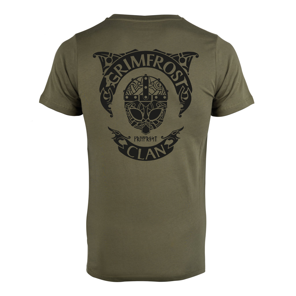 It is printed with "Grimfrost Clan" and a Viking helmet on the back. The front has a helmet print and Grimfrost written in runes.