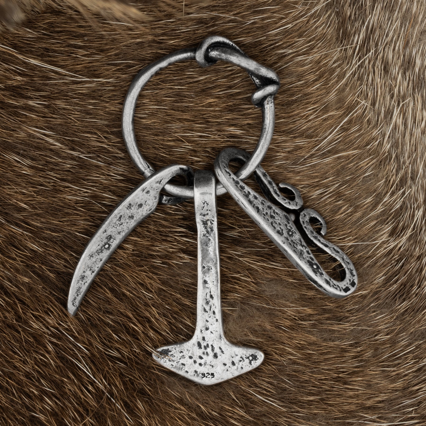Amulet rings were important in Scandinavia before and during the Viking Age. They consisted out of a ring in which different charms and amulets were hung. The amulets had different shapes ranging from sickles and fire-steels to rings, axes and Thor's Hammers. Amulet rings have been found both in Viking Age graves and excavated living quarters. Our amulet ring comes with the commonly seen sickle, fire-steel and Thor's Hammer.
