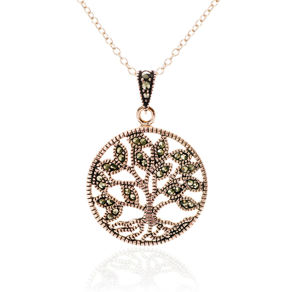 A beautiful pendant inspired by Yggdrasil, the world tree in Norse mythology. Expertly handmade of solid sterling silver 925 with an 18 carat rose gold plating and marcasite stones, this pendant is guaranteed to please.