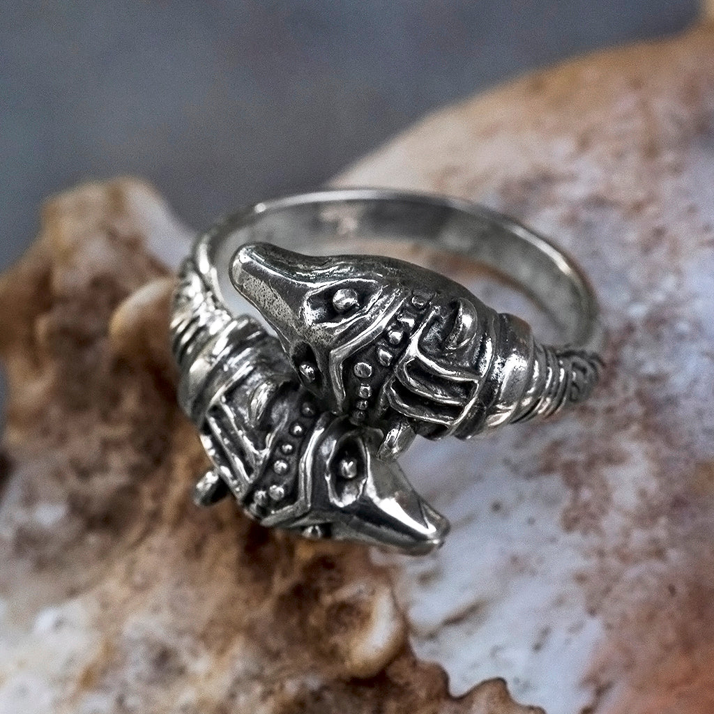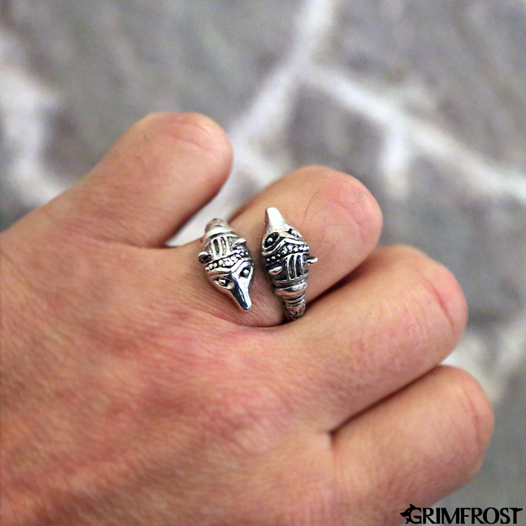 Ring in solid Sterling Silver 925 ending in bear heads that are based on the unique find in Eketorp, Sweden in 2017. Dated to the 900s, the bear heads are remarkable in the sense that nothing similar has been found. They are also interesting, since bears are not found on jewelry as often as other animals and creatures. The ring is adjustable in size and can fit most fingers.
