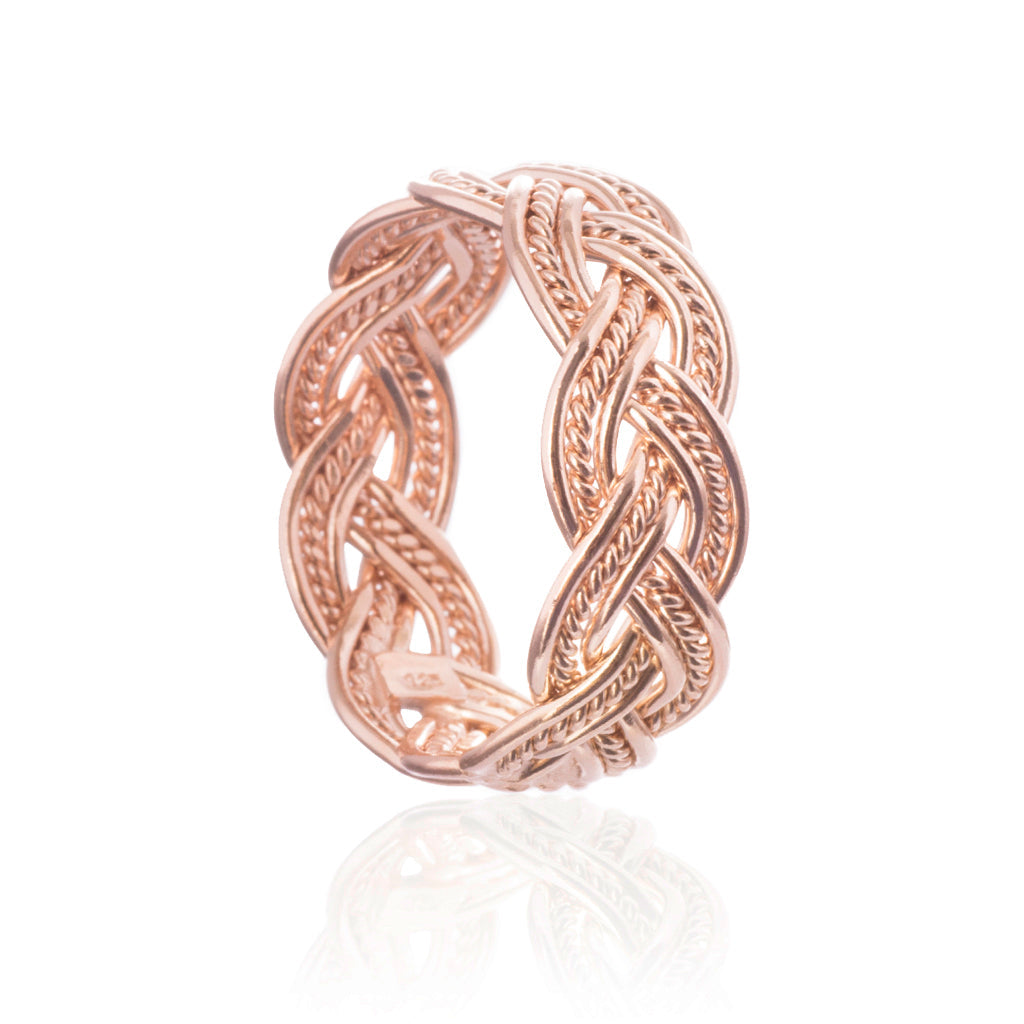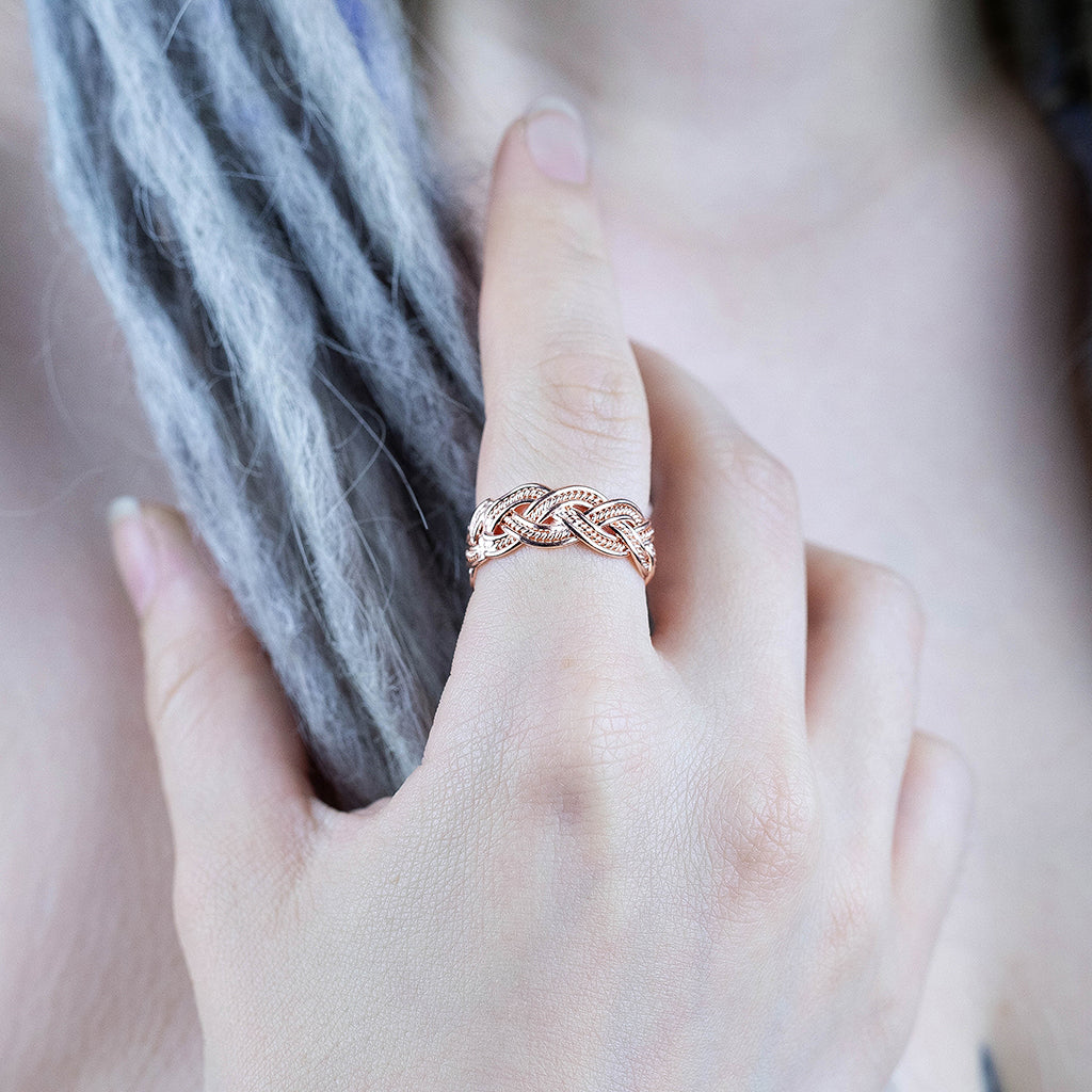 A beautiful ring with a classic knotwork design named after Frigg, the queen of Viking gods. Expertly handmade of solid sterling silver 925 with an 18 carat rose gold plating, this ring is guaranteed to please.