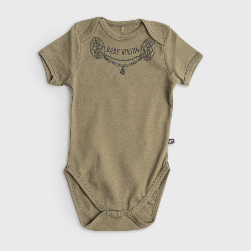 Hochwertiger Baby-Body mit klassischem Wikingerzeit-Motiv, das Schalenfibeln und eine Perlenkette dazwischen zeigt. Über den Perlen steht "Baby Viking" geschrieben. Er wurde speziell für Grimfrost aus weicher, luxuriöser Bio-Baumwolle hergestellt. Sogar die Färbe- und Druckverfahren sind vollständig biologisch, was sowohl für das Baby als auch für Mutter Erde gut ist.