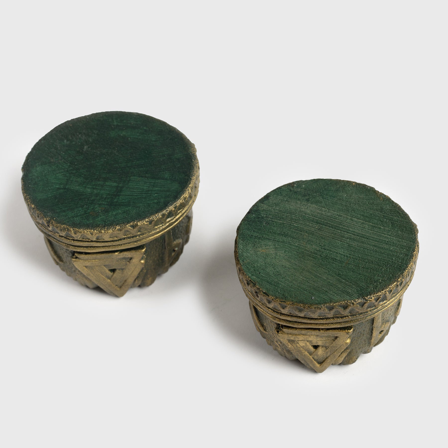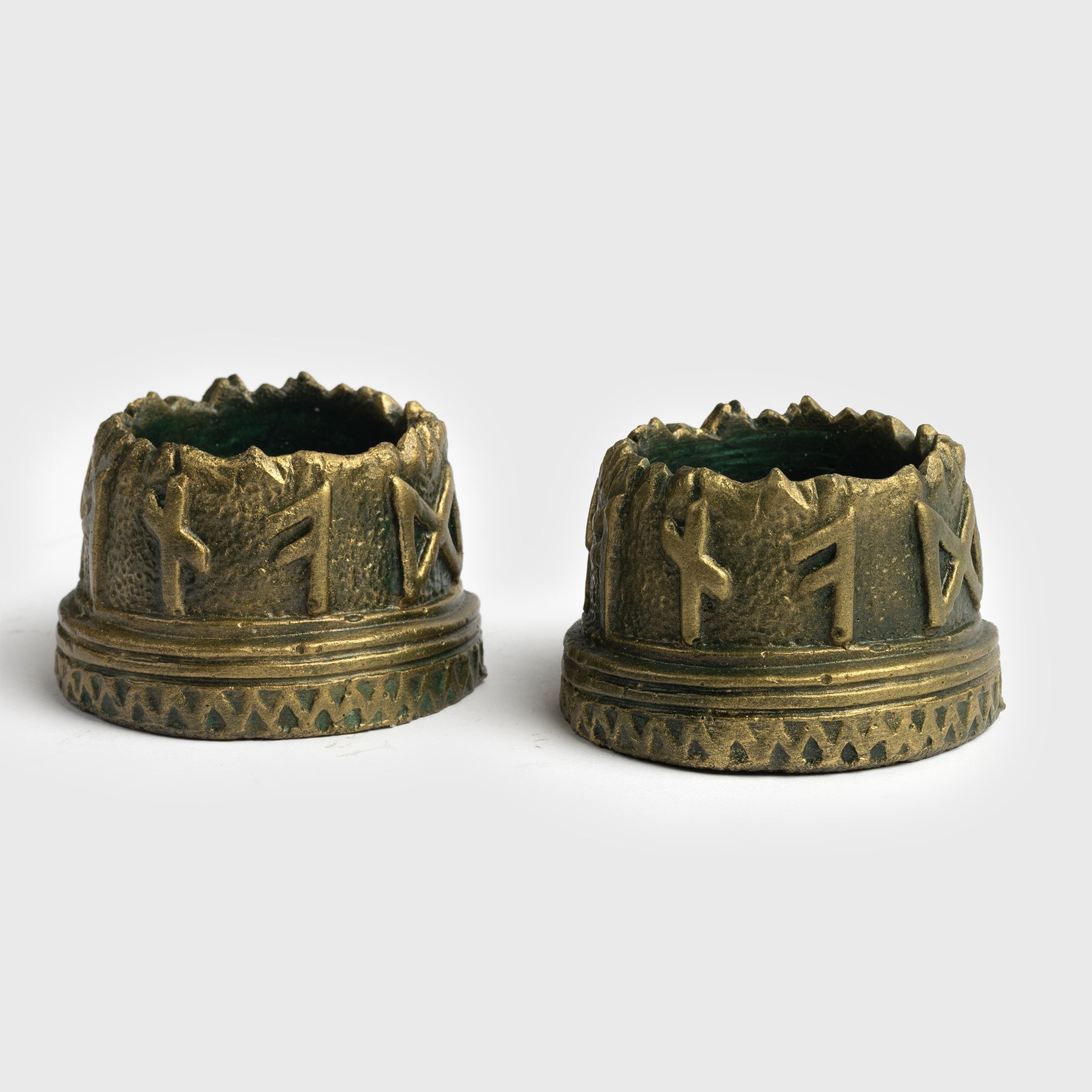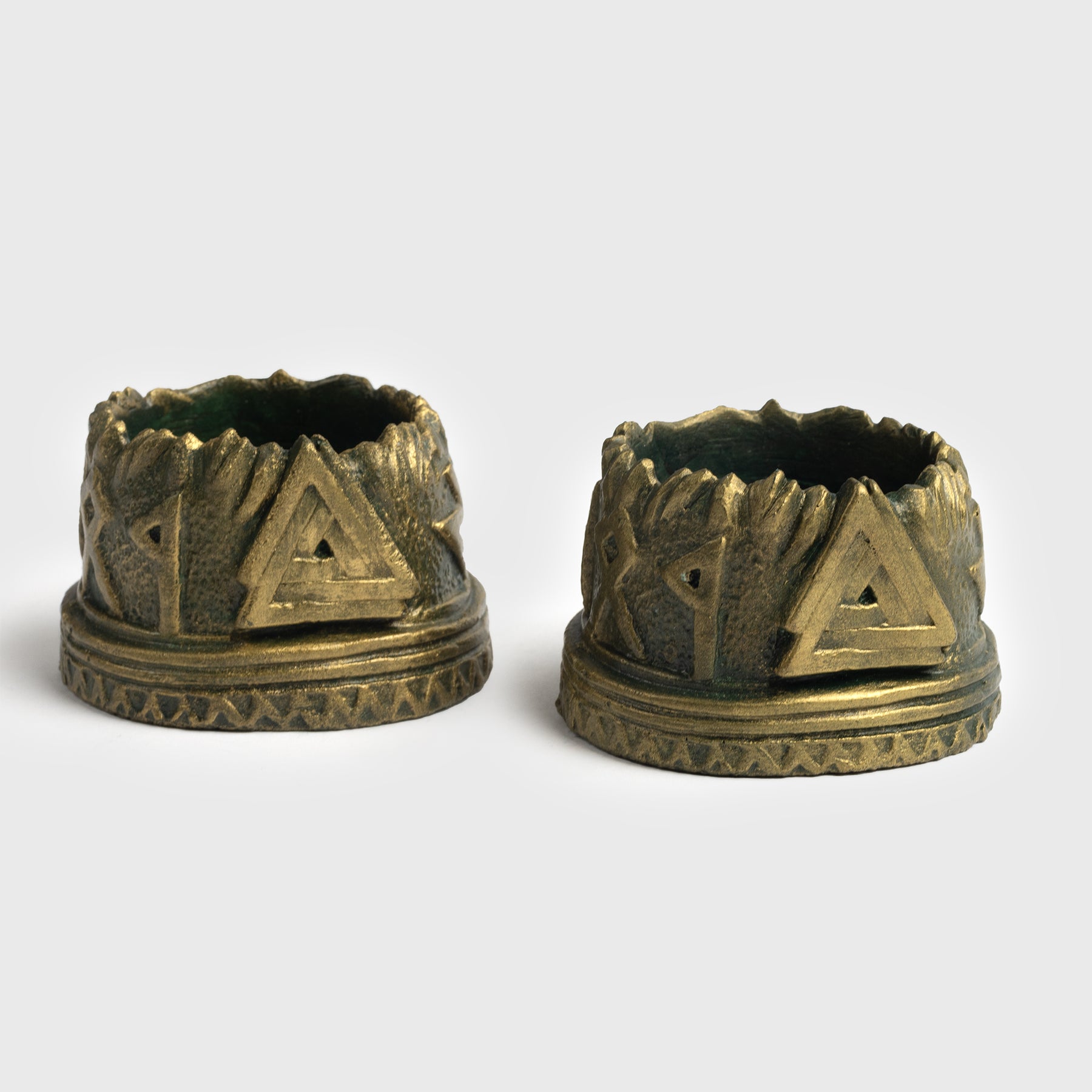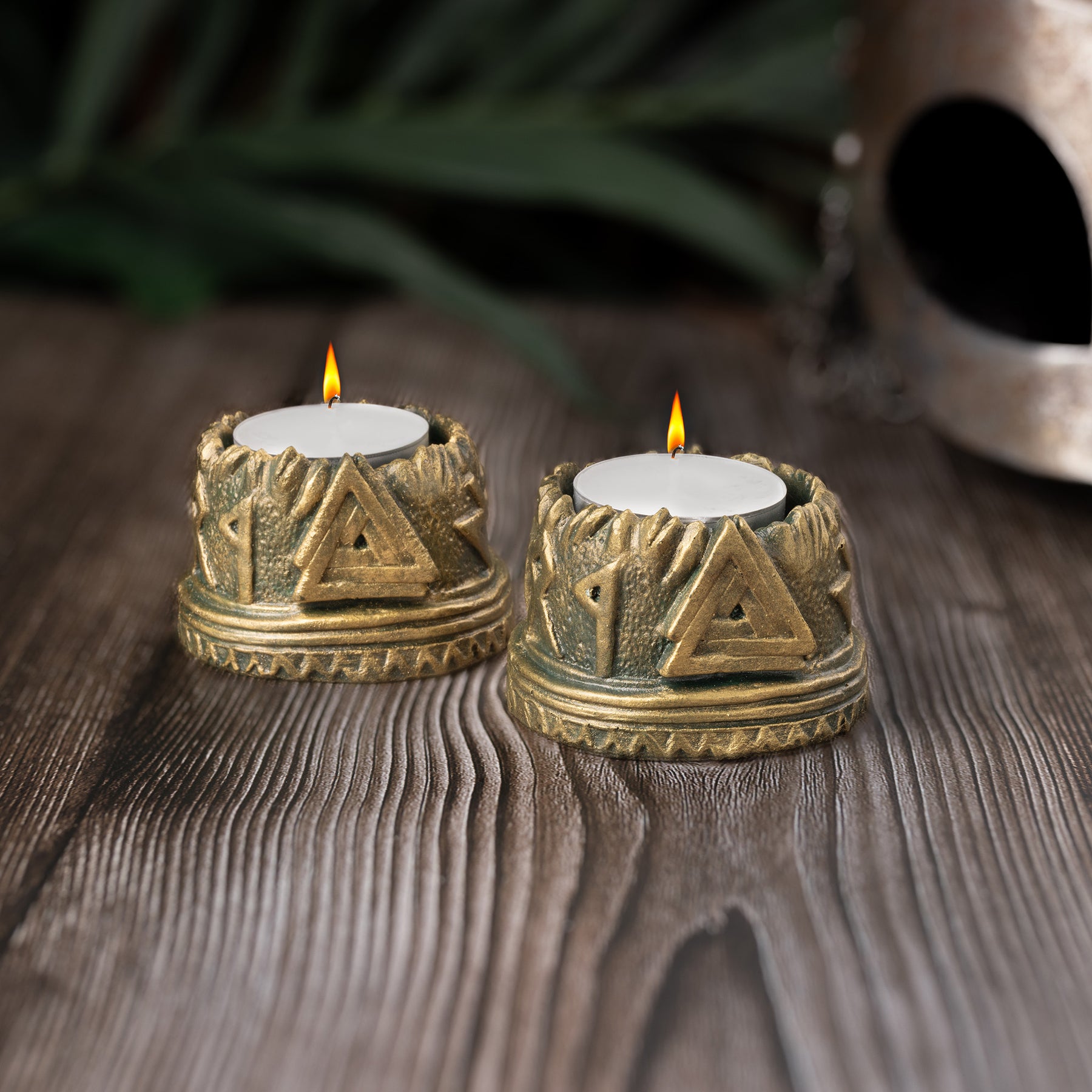 Zwei handgefertigte Teelichthalter mit dem Valknut-Symbol, das mit Odin assoziiert wird, und Runen, die „Wodanas“ - den alten Namen von Odin - bedeuten.