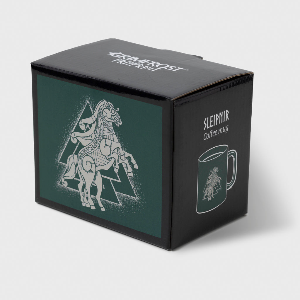 Kaffeebecher aus Keramik mit Sleipnir, Odins 8-beinigem Ross, und einer Valknut.