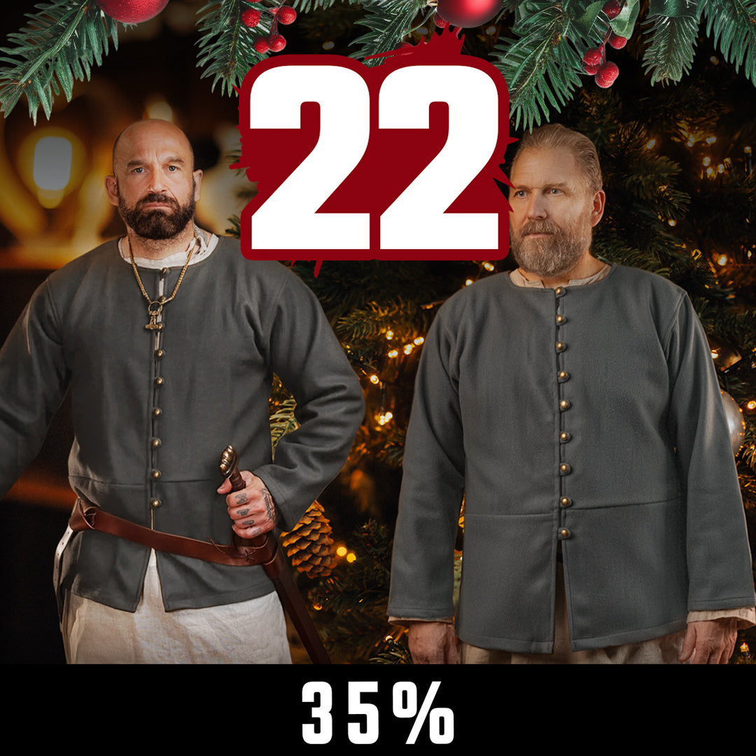 Strapazierfähige Wolljacke nach dem Vorbild der Kleidungsstücke aus dem Hafen von Hedeby. Es ist nicht bekannt, wie sie zusammengehalten wurde, daher gibt es zahlreiche Alternativen. Wir haben uns für die Variante mit Messingknöpfen entschieden, die eine stilvolle Passform ergibt.