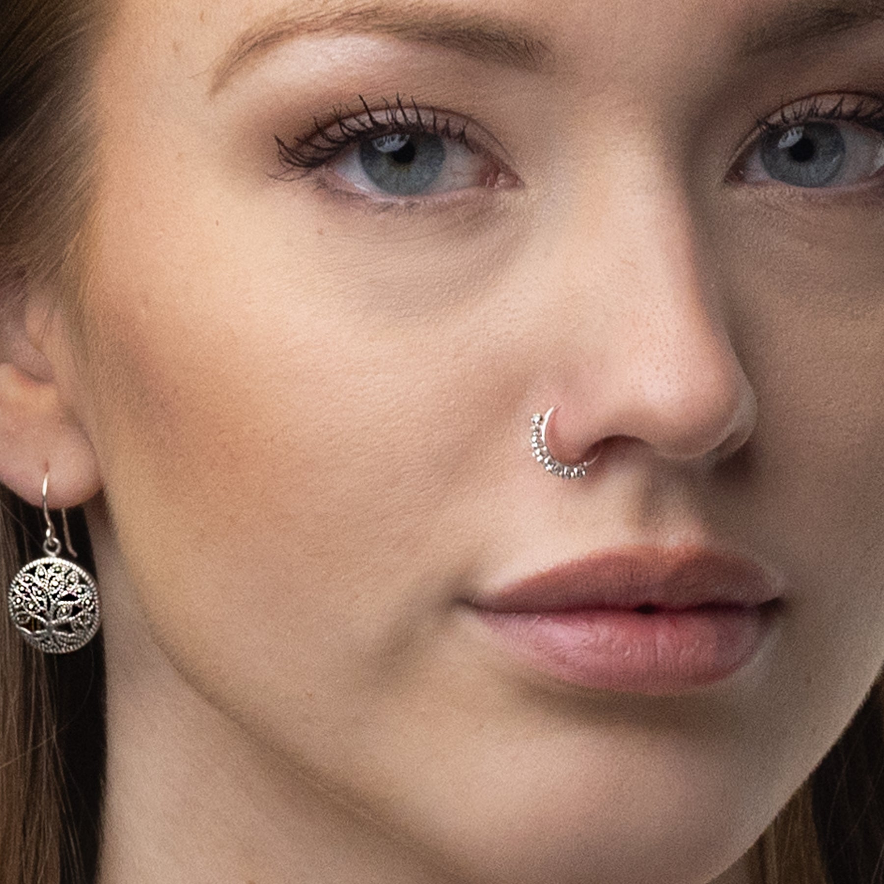 Eleganter Nasenring aus Sterlingsilber 925 mit 8 funkelnden Steinen. Leicht einzusetzen und angenehm zu tragen.