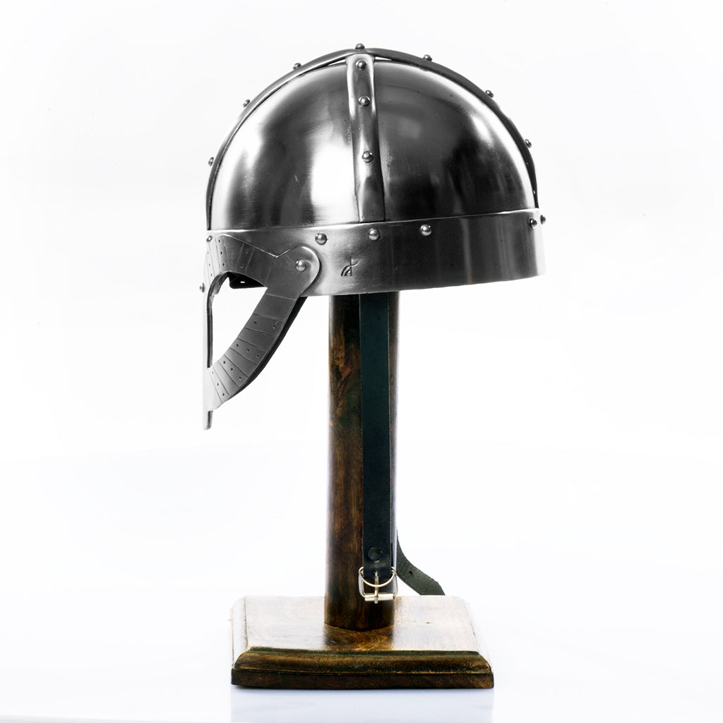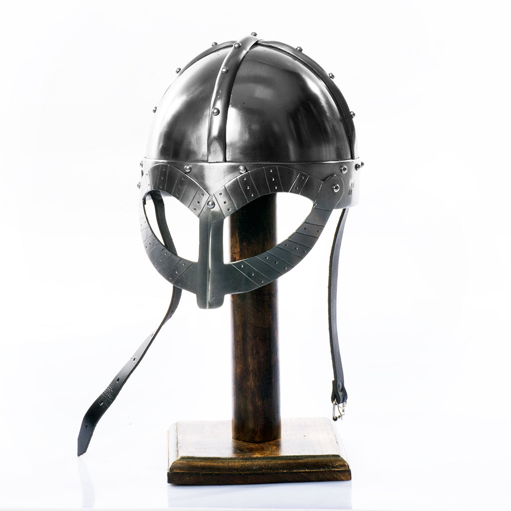 Helm nach dem Vorbild des Wikingerhelms Gjermundbu - das einzige bekannte Beispiel eines vollständigen Wikingerhelms, das existiert. Archäologische Funde zeigen, dass Wikingerhelme aus Eisen in Form einer runden Kappe aus vier Platten mit Metallstreifenverstärkungen an Krempe und Krone gefertigt wurden. Außerdem waren sie mit einem Brillenschutz um die Augen und die Nase versehen.