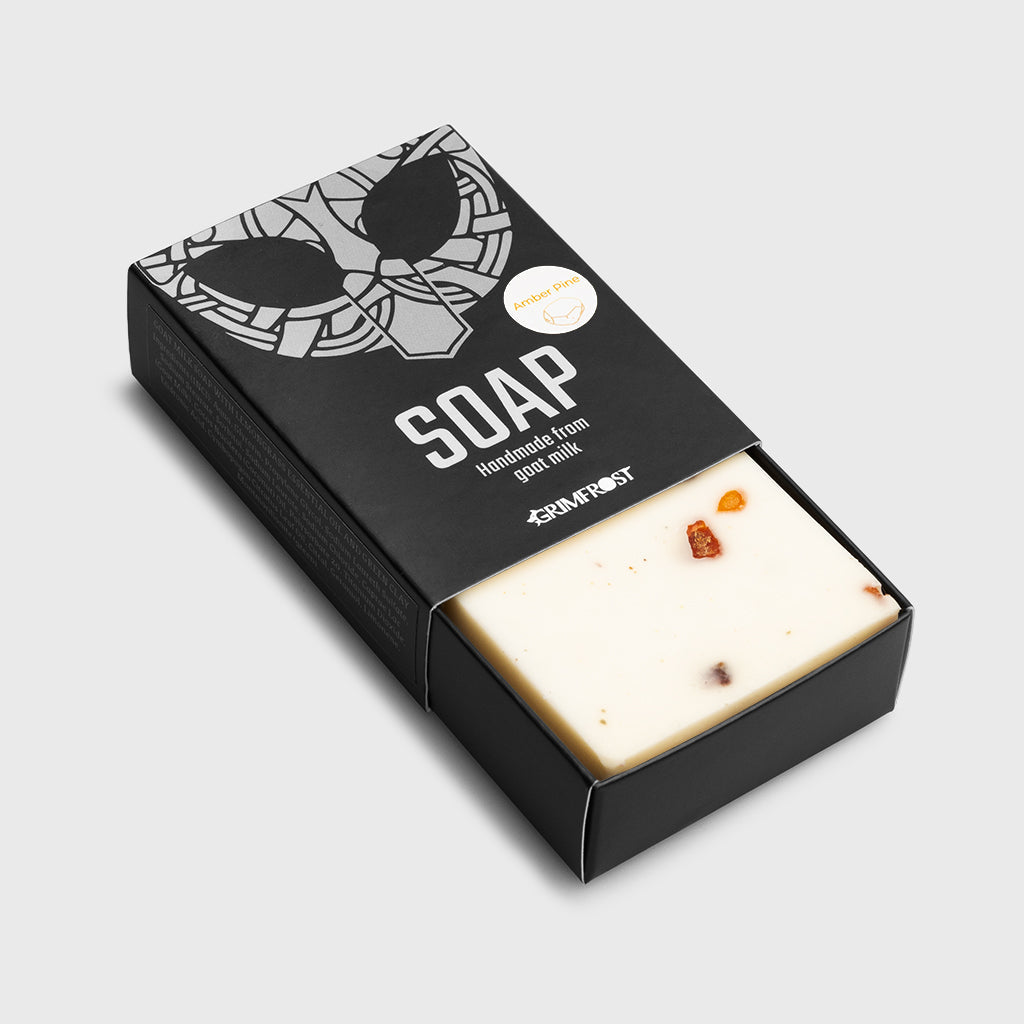 Seife für den modernen Wikinger, handgemacht von baltischen Meistern aus Ziegenmilchpaste. Mit einem erfrischenden Kiefernduft und schönen, authentischen baltischen Bernsteinstücken reinigt, pflegt und verjüngt sie Ihre Haut.