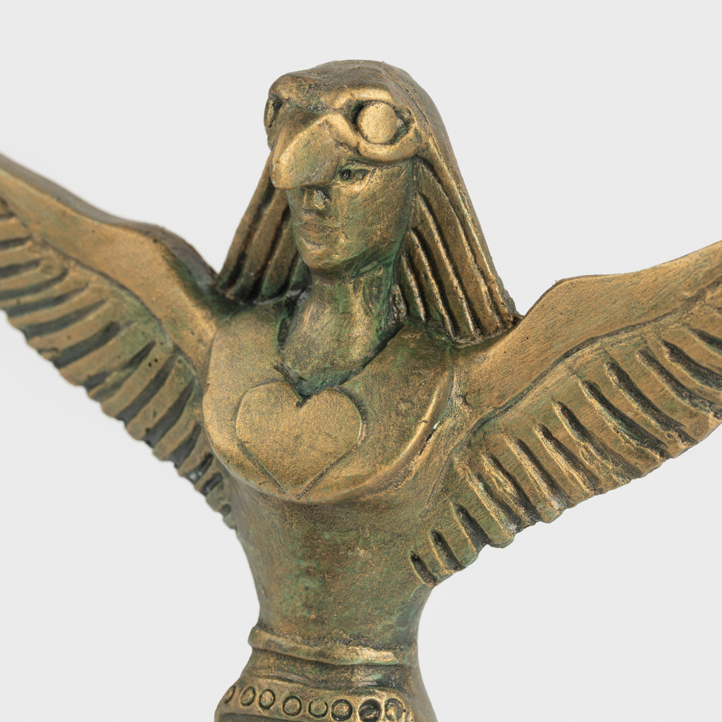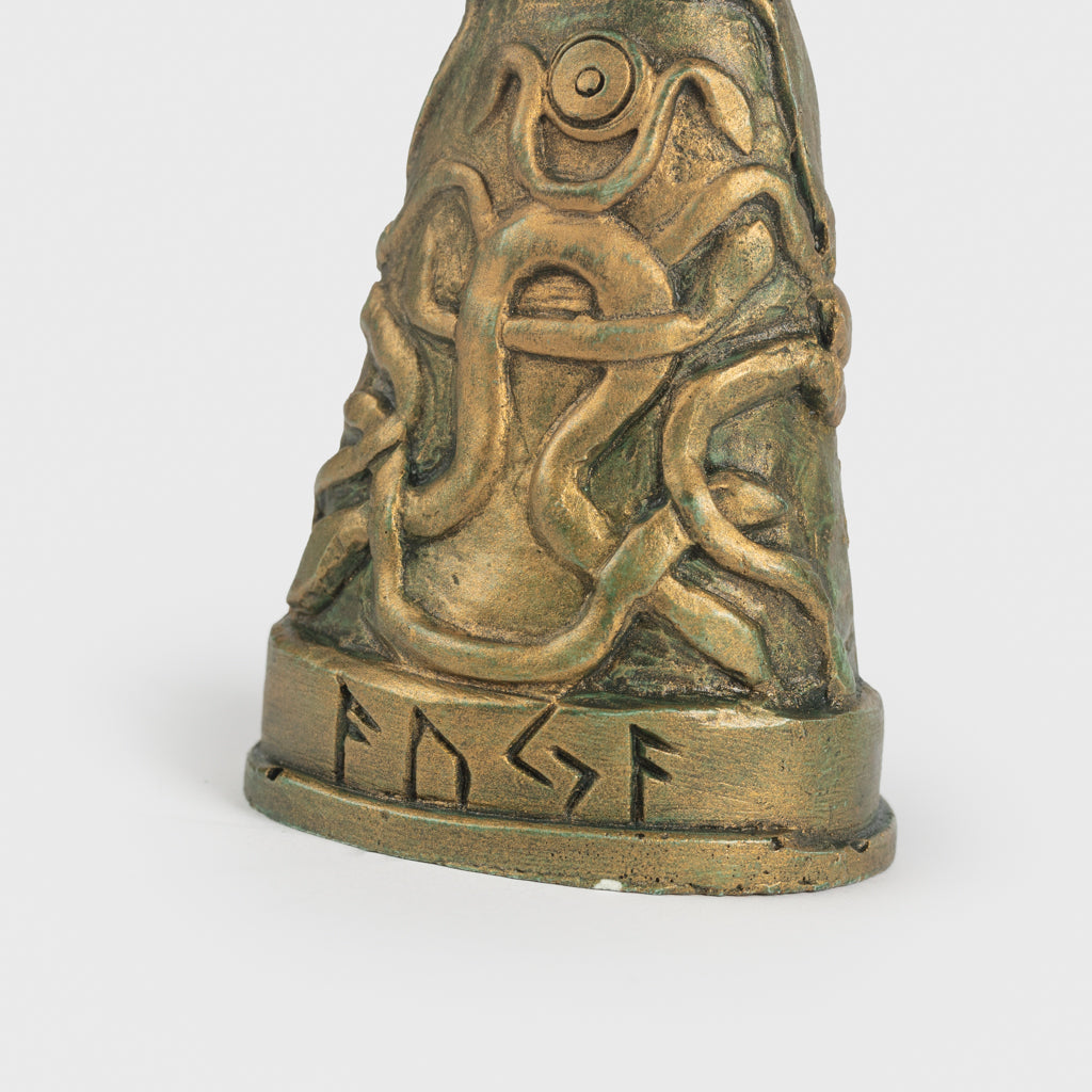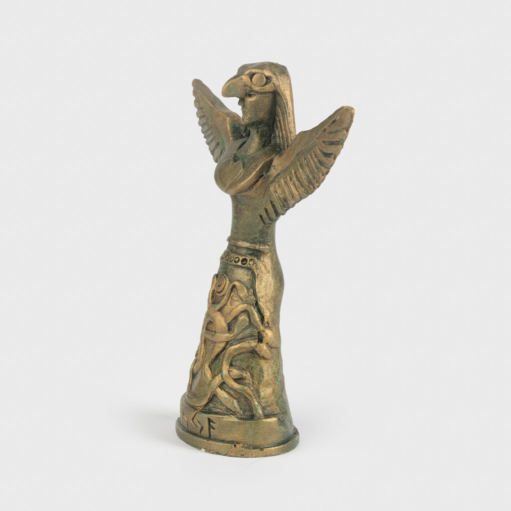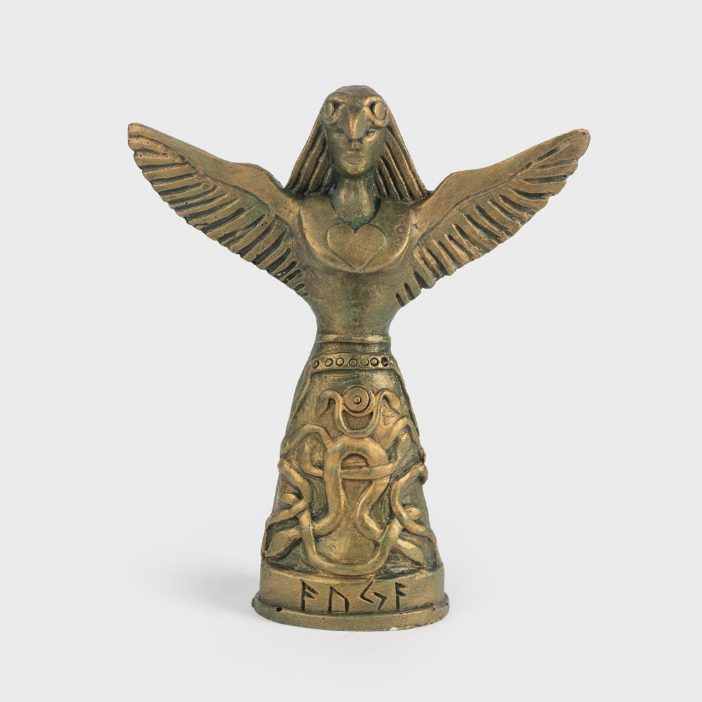 Eine fantastische Statue von Freyja in ihrem Falkenkleid, das die Trägerin zum Fliegen befähigt. Der Sockel ist mit Schlangen und Runen verziert. Die Schlangen stehen in Verbindung mit der alten Guta-Saga, wo sie mit Geburt und Fruchtbarkeit in Verbindung gebracht werden. Die Runen buchstabieren AUJA, was Glück und Zufriedenheit bedeutet. Wie die meisten nordischen Götter ist auch Freyja mit vielen Dingen assoziiert, wie Liebe, Schönheit, Fruchtbarkeit, Sex, Krieg, Gold und Wahrsagerei.