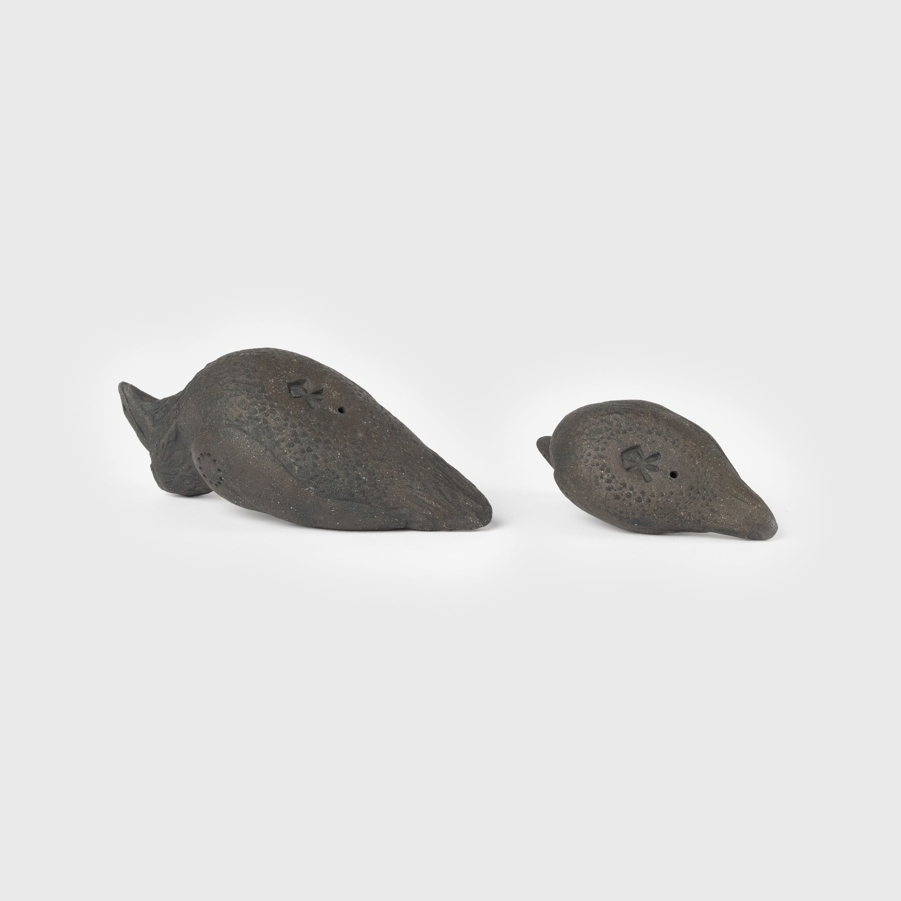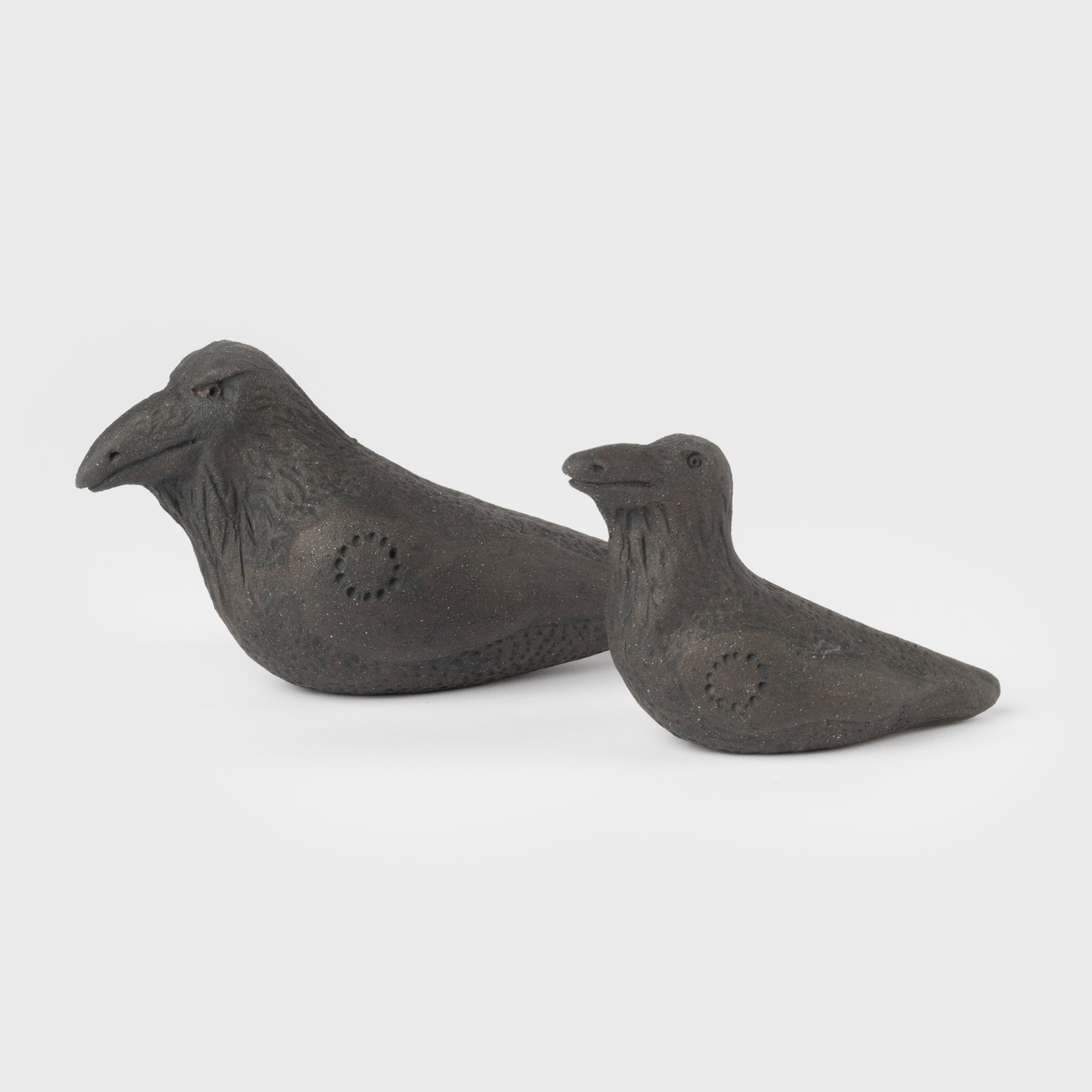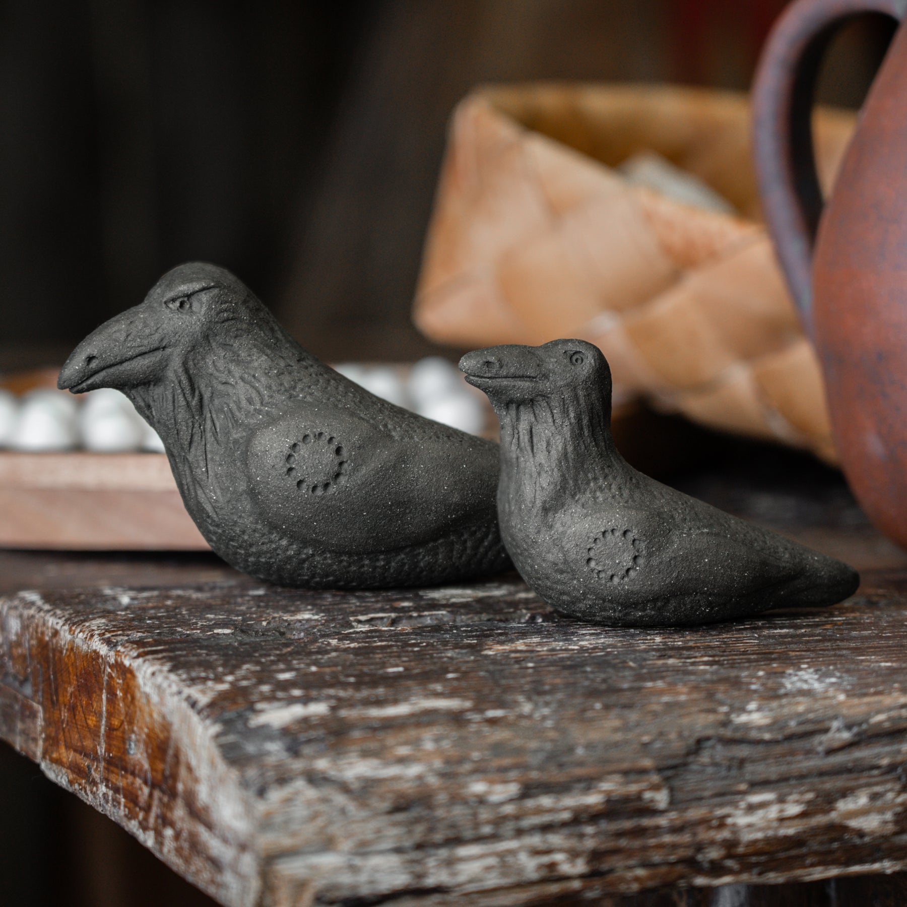 Handgefertigter Rabe aus Lehm, der perfekt geeignet ist, Hugin oder Munin, die Raben von Odin, darzustellen. Platziere ihn (oder sie) dort, wo er die Dinge im Auge behalten kann.