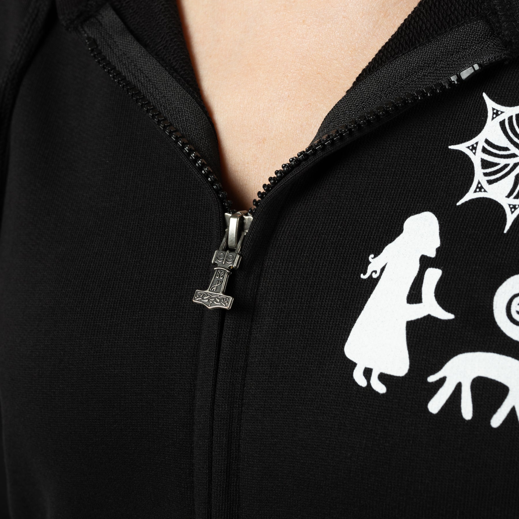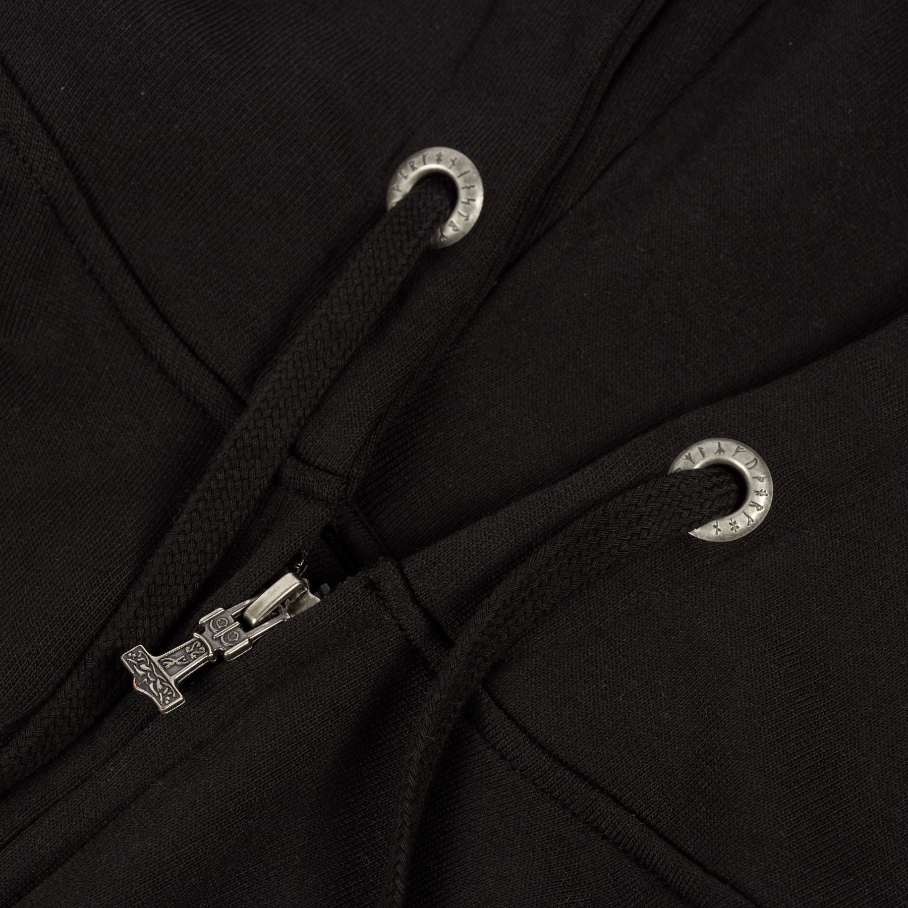 Lernen Sie Ihren neuen Lieblings-Hoodie kennen. Dieser Premium Kapuzenpullover mit Reißverschluss wurde speziell für Grimfrost aus weicher, luxuriöser Bio-Baumwolle hergestellt. Sogar die Färbe- und Druckverfahren sind komplett biologisch, was sowohl für Sie als auch für Mutter Erde gut ist. Der Hoodie kommt mit geräumigen Kängurutaschen. Zusätzlich haben wir den Reißverschluss mit einem Thorshammer-Schiebergriff und die Ösen des Kordelzugs mit einem Runenkreis des Jüngeren Futhark versehen.