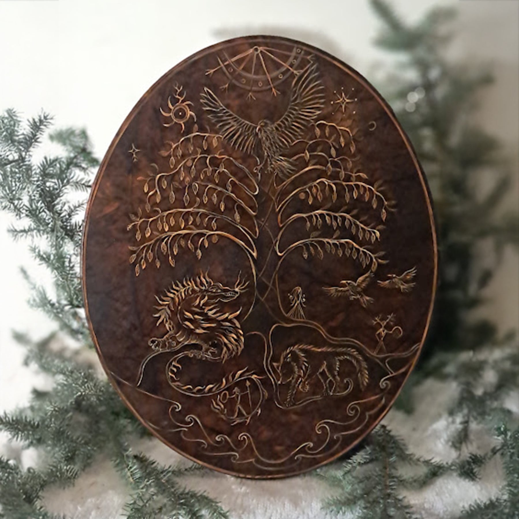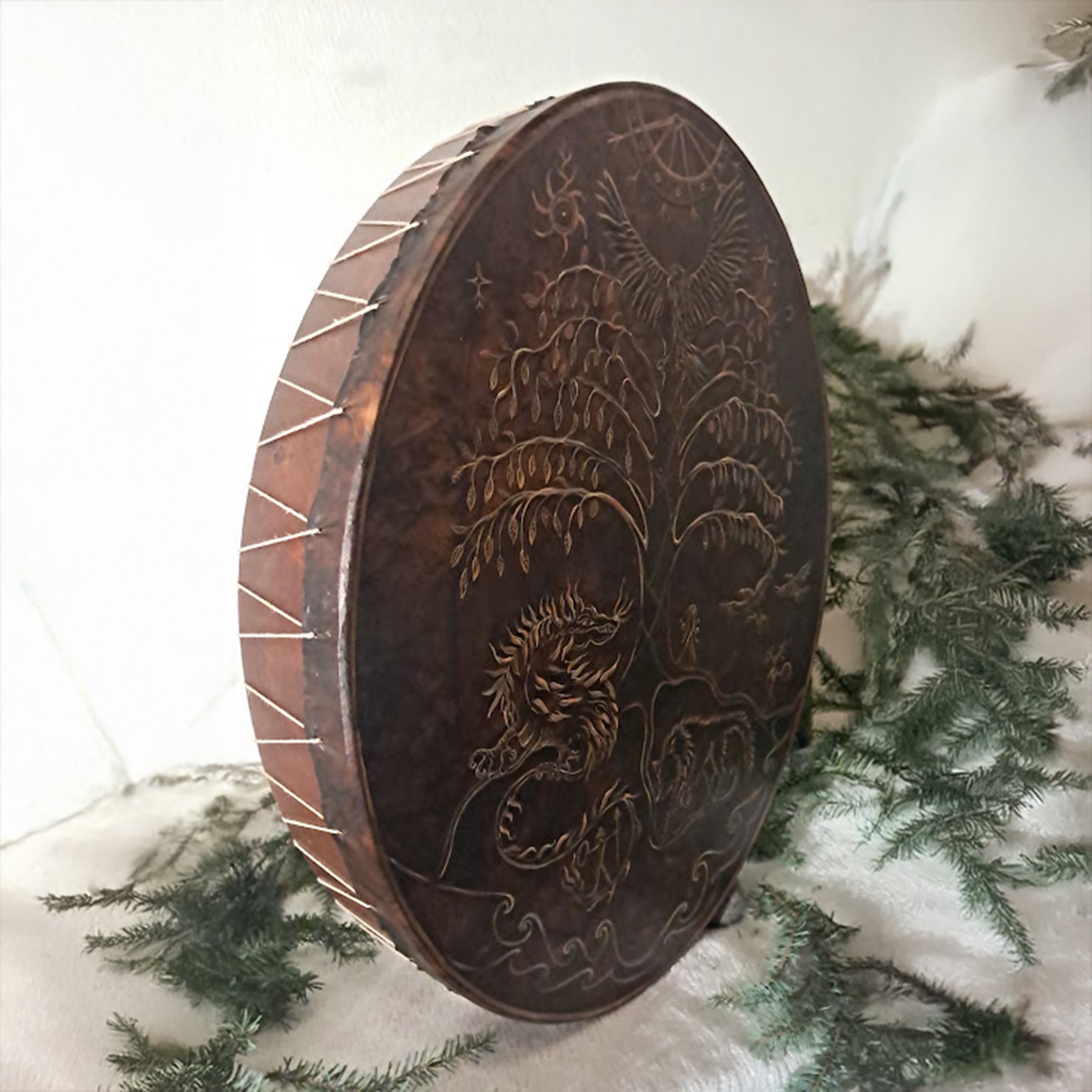 Yggdrasil, der Weltenbaum, ist wunderschön von Hand auf das Trommelfell gemalt. Yggdrasil ist in der Weltanschauung der Wikingerzeit sehr wichtig. Das gesamte Universum ist um ihn herum aufgebaut.