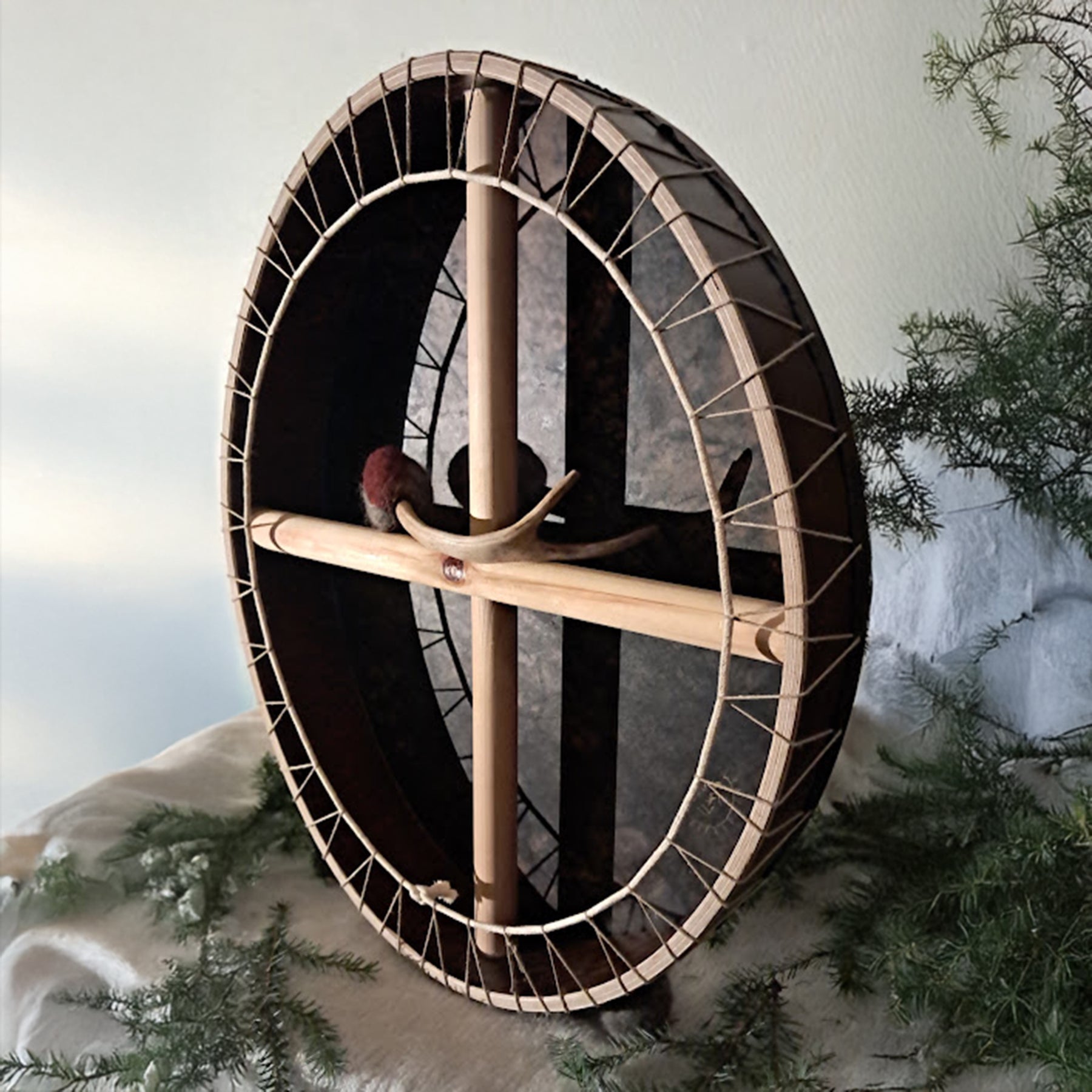 Traditionelle Schamanentrommel, die in sorgfältiger Handarbeit in Finnland hergestellt wird, wo alte nordische schamanische Traditionen über Jahrhunderte hinweg überlebt haben. Sie wurde aus traditionellen Materialien ohne den Einsatz von Werkzeugen hergestellt. Lediglich eine Handsäge, ein Messer und Schmirgelpapier wurden während des Prozesses verwendet. Diese Herstellungsmethode braucht Zeit, aber sie ist notwendig, wenn die Trommel einen eigenen Geist haben soll.