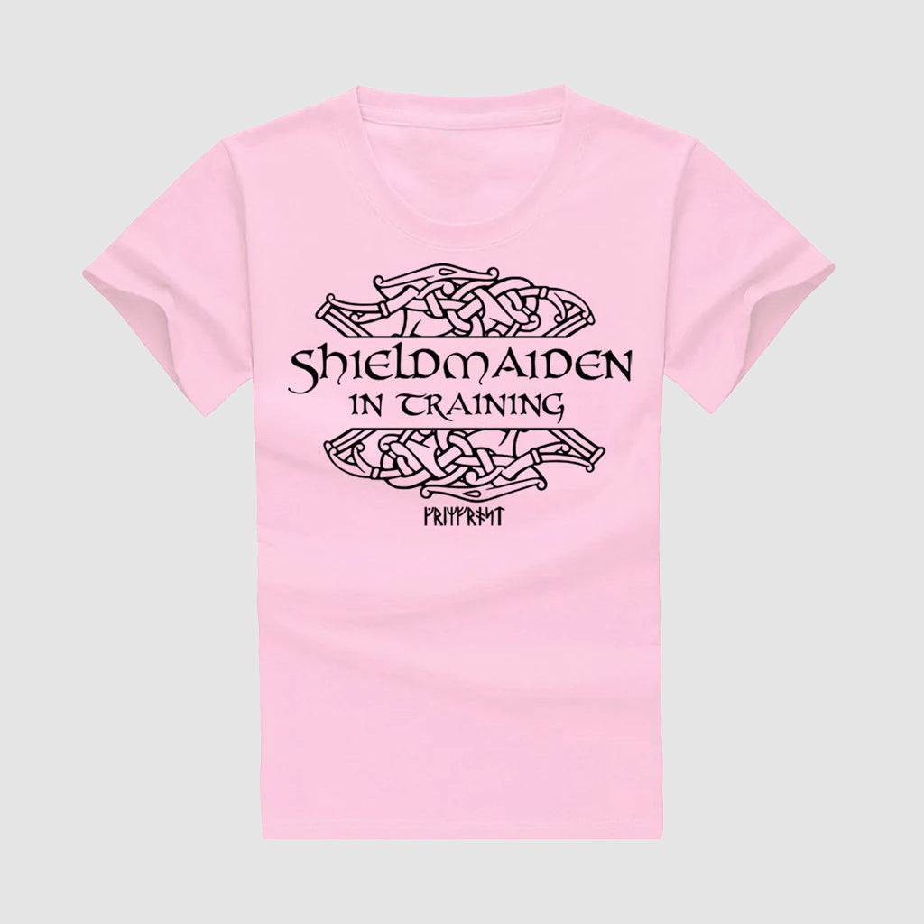 Hochwertiges, in Schweden handbedrucktes Kinder-T-Shirt mit einem Aufdruck auf der Vorderseite: "Shieldmaiden in Training". Produktion und urheberrechtlich geschütztes Design von Grimfrost.