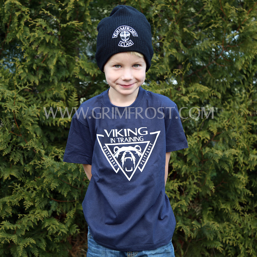 Hochwertiges, in Schweden handbedrucktes Kinder-T-Shirt mit einem Aufdruck auf der Vorderseite: "Viking in Training" und ein brüllender Bär. Produktion und urheberrechtlich geschütztes Design von Grimfrost.