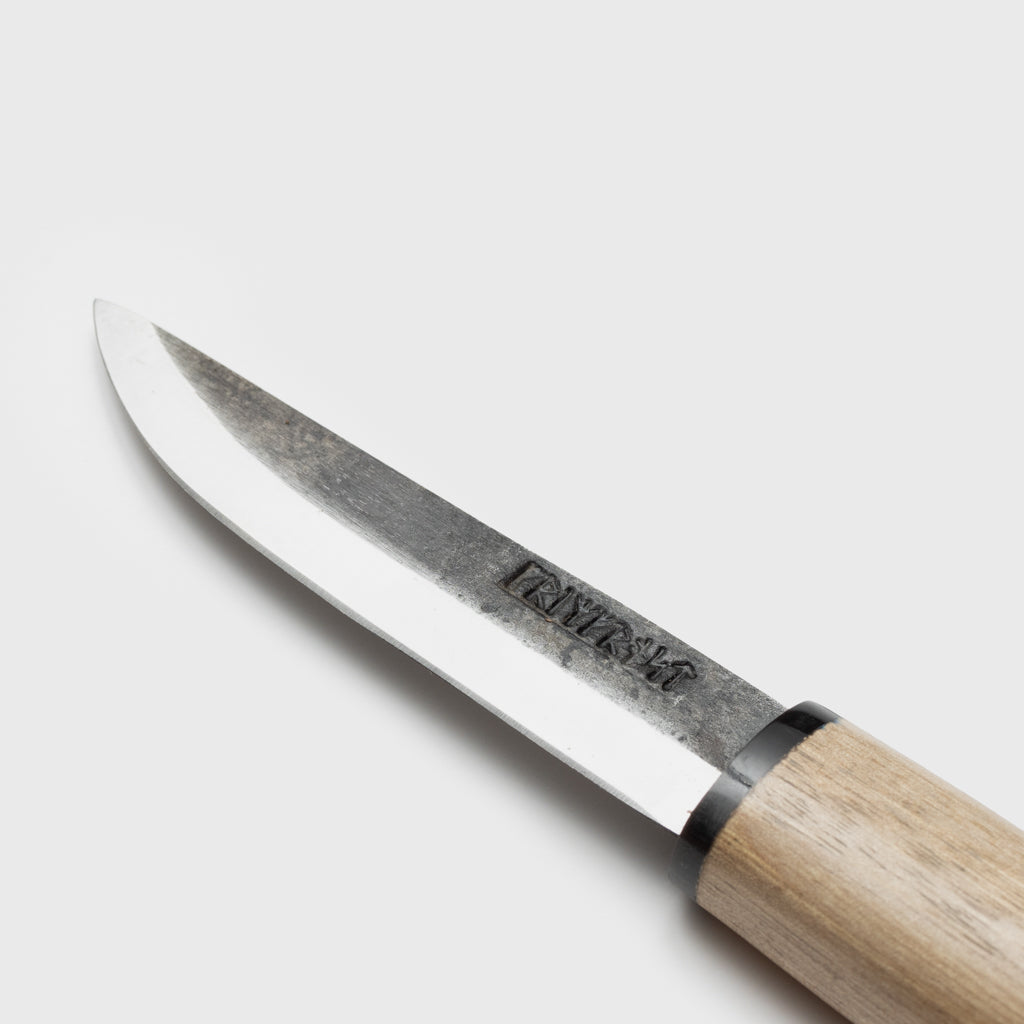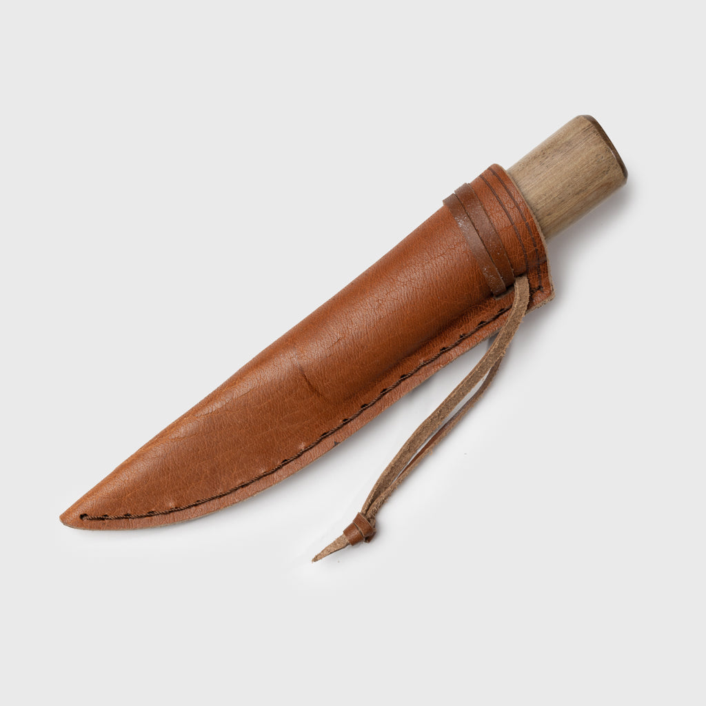 Allzweckmesser, wie es in Skandinavien seit der Wikingerzeit verwendet wurde und noch immer weit verbreitet ist. Es hat eine handgeschmiedete, geschliffene Klinge aus Kohlenstoffstahl und einen Griff aus Walnussholz und Horn. Die Lederscheide ist handgenäht. Grimfrost ist mit Runen auf der Klinge geschrieben.