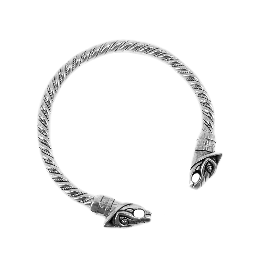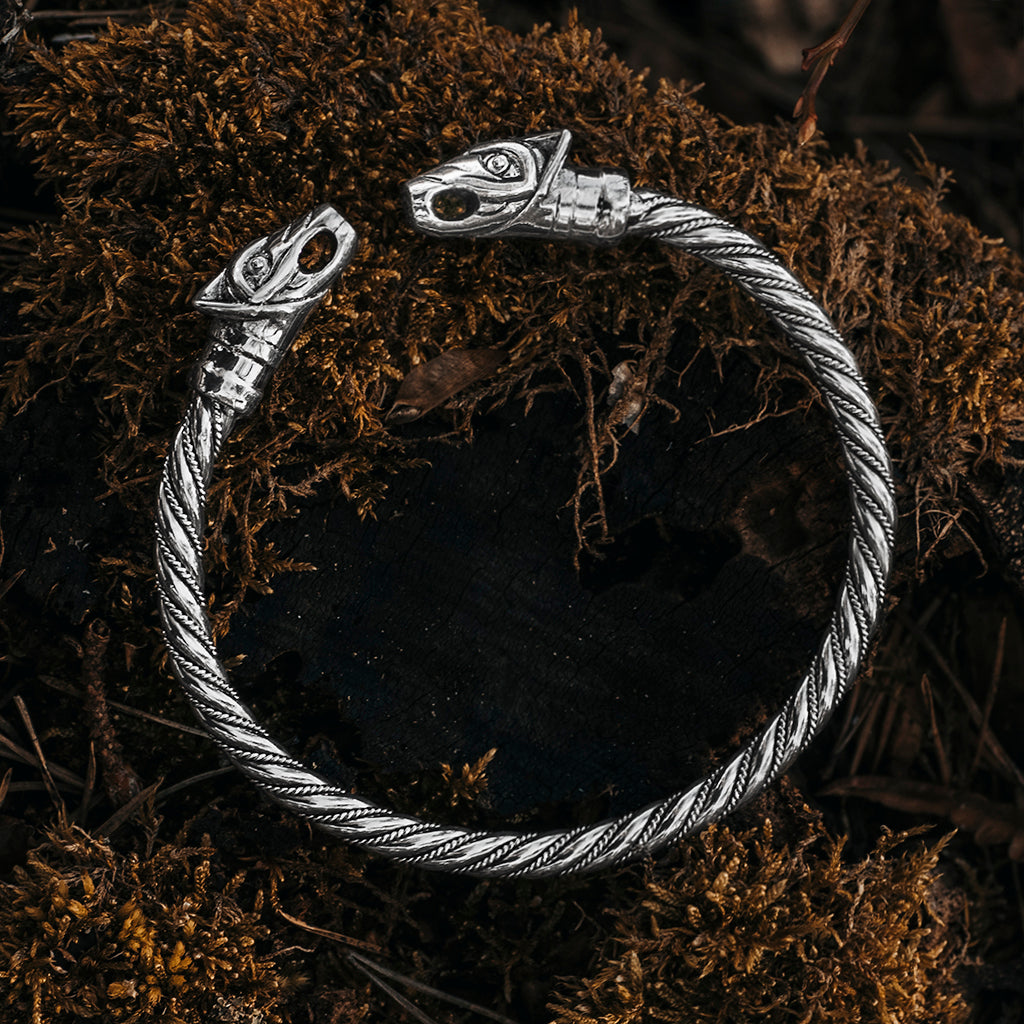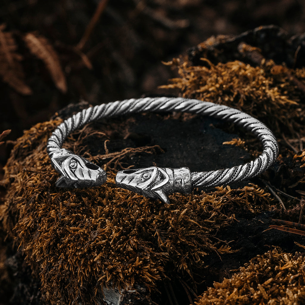 Ein gedrehter Wikinger-Armreif aus massivem Sterlingsilber 925, der in den Köpfen von Geri und Freki (Altnordisch: "der Gefräßige" oder "der Gierige") endet - den beiden Wölfen, die den nordischen Gott Odin begleiteten. Tragen Sie ihn um Ihr Handgelenk und schieben Sie ihn den Arm hinauf, wenn Sie ihn aus dem Weg räumen müssen.
