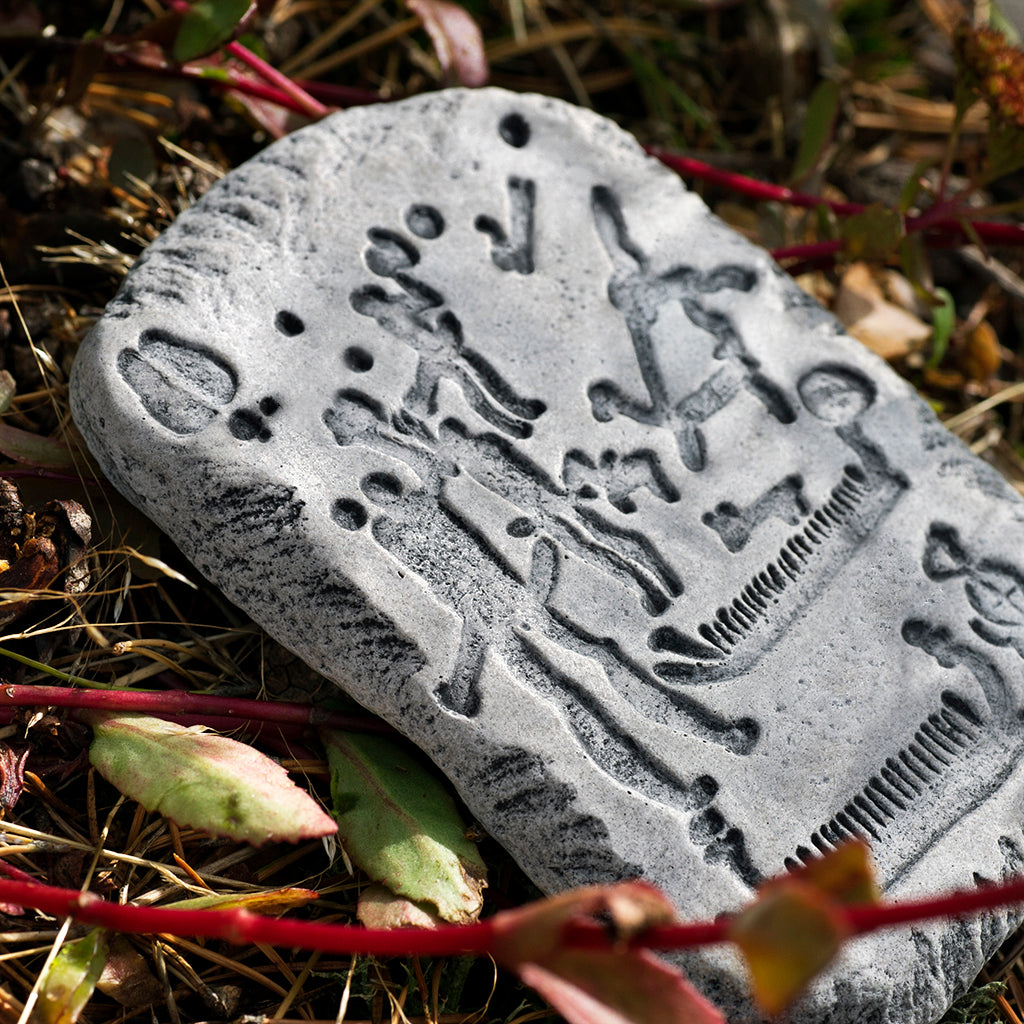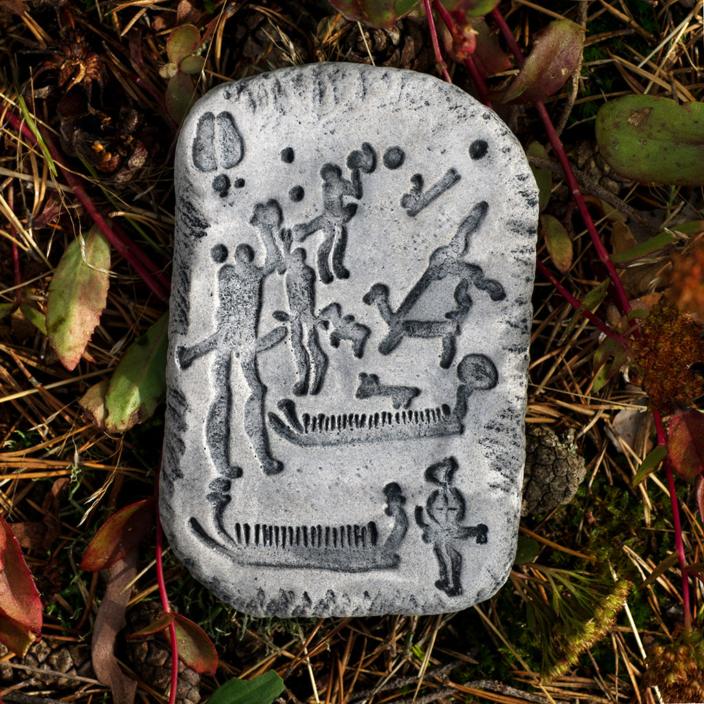 Eine Felsgravur aus Tanumshede, Schweden, die eine Jagd und eine Schlacht aus der Bronzezeit darstellt.