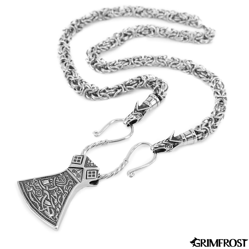 Die Wikinger verwendeten Halsketten mit Tieren oder Bestien, die sich in einen Ring verbeißen, an dem Anhänger aufgehängt sind. Diese Variante besteht aus einer King Chain, die in den Köpfen von Geri und Freki, den Wölfen Odins, endet, die auf einen Ring mit einem großen Axt-Anhänger beißen. Wie der Name schon sagt, ist dies der König aller Ketten und galt bei den Wikingern als Zeichen von Erfolg und Macht.