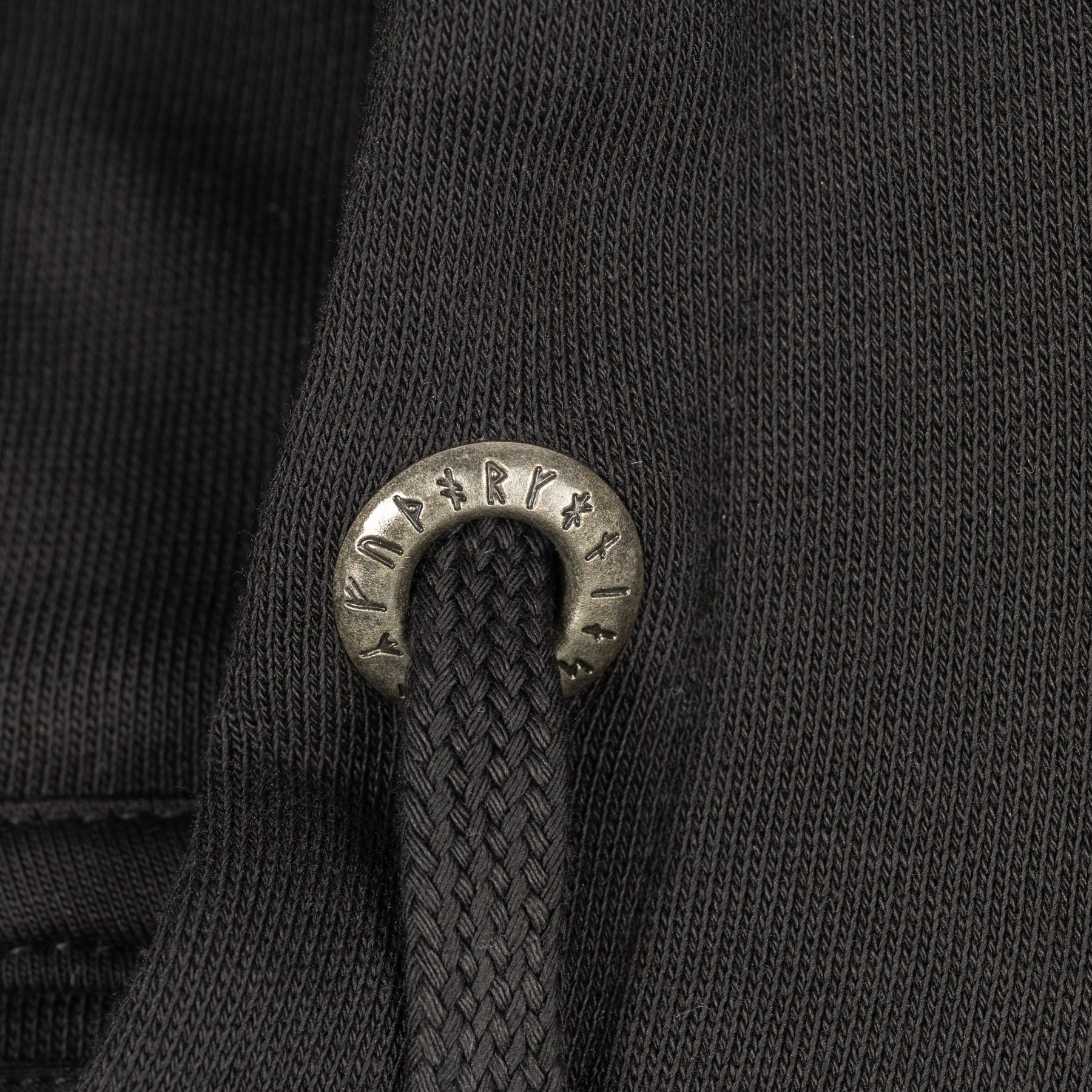 Weicher und bequemer Hoodie in klassischem Schwarz. Der Kapuzenpulli kommt mit einer praktischen Reißverschlusstasche am linken Arm und geräumigen Kängurutaschen. Um das Ganze abzurunden, haben wir die Ösen des Kordelzugs mit einem Runenkreis des Jüngeren Futhark versehen.