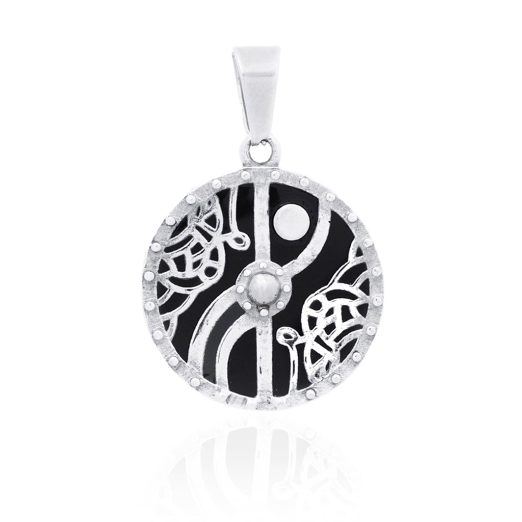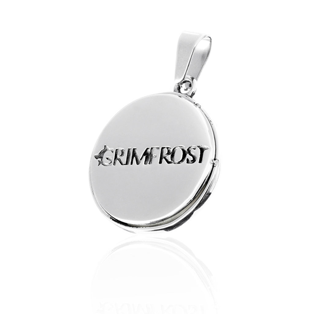 Sehr detaillierter, schöner Anhänger in Form von Grimfrosts Schild, bei dem das Design über die schwarze Oberfläche geschichtet ist. Es ist perfekt, um es als Alltagsanhänger um den Hals zu tragen.