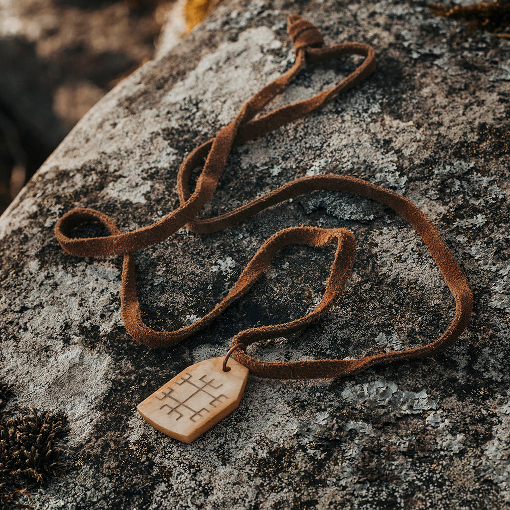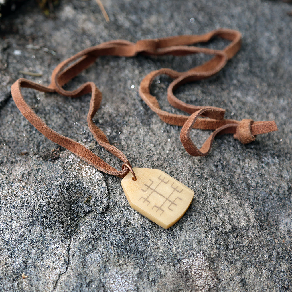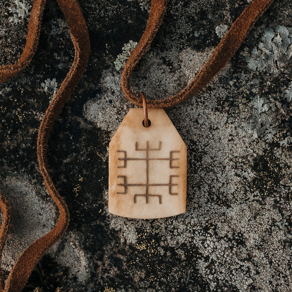 Handgefertigtes Knochenamulett mit einer Variante des Herzlustafir - einer isländischen magischen Daube, die den Mut steigern soll.