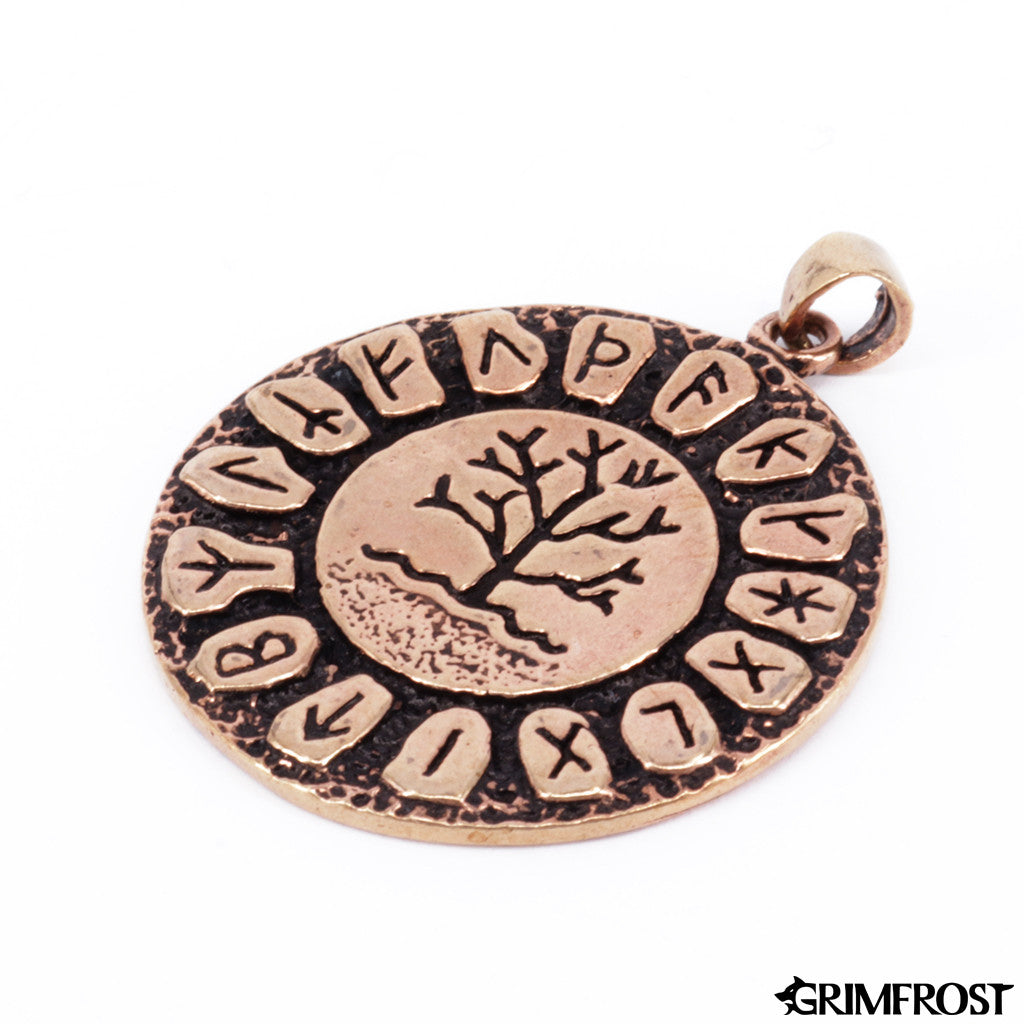 Ein Yggdrasil-Amulett aus Bronze, umgeben von einem Runenkreis.
