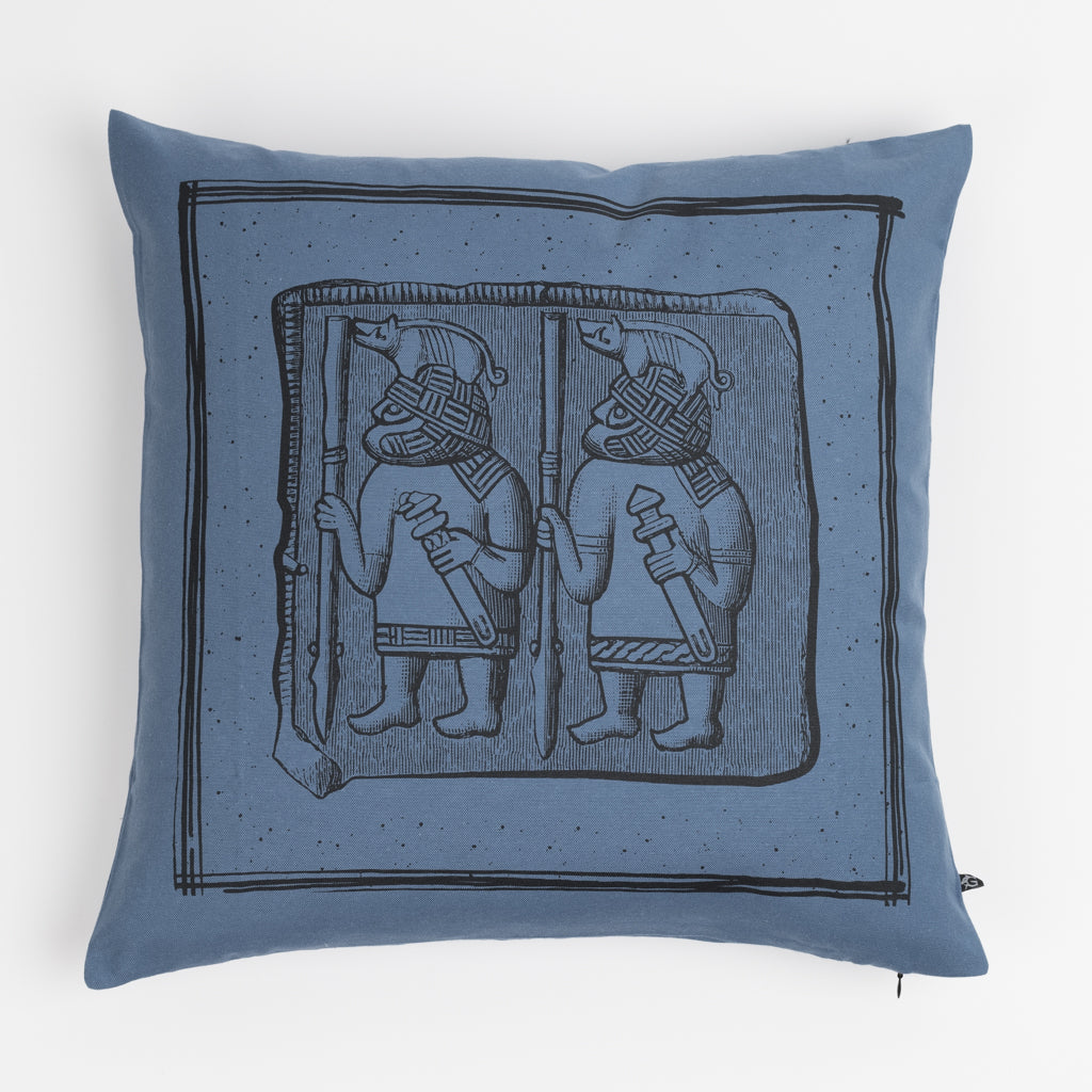 Dieses Motiv ist bekannt als "schreitende Krieger mit Speeren". Es zeigt zwei antike Krieger mit Helmendie mit Wildschweinkämmen geschmückt sind, Schwertern und Speeren.