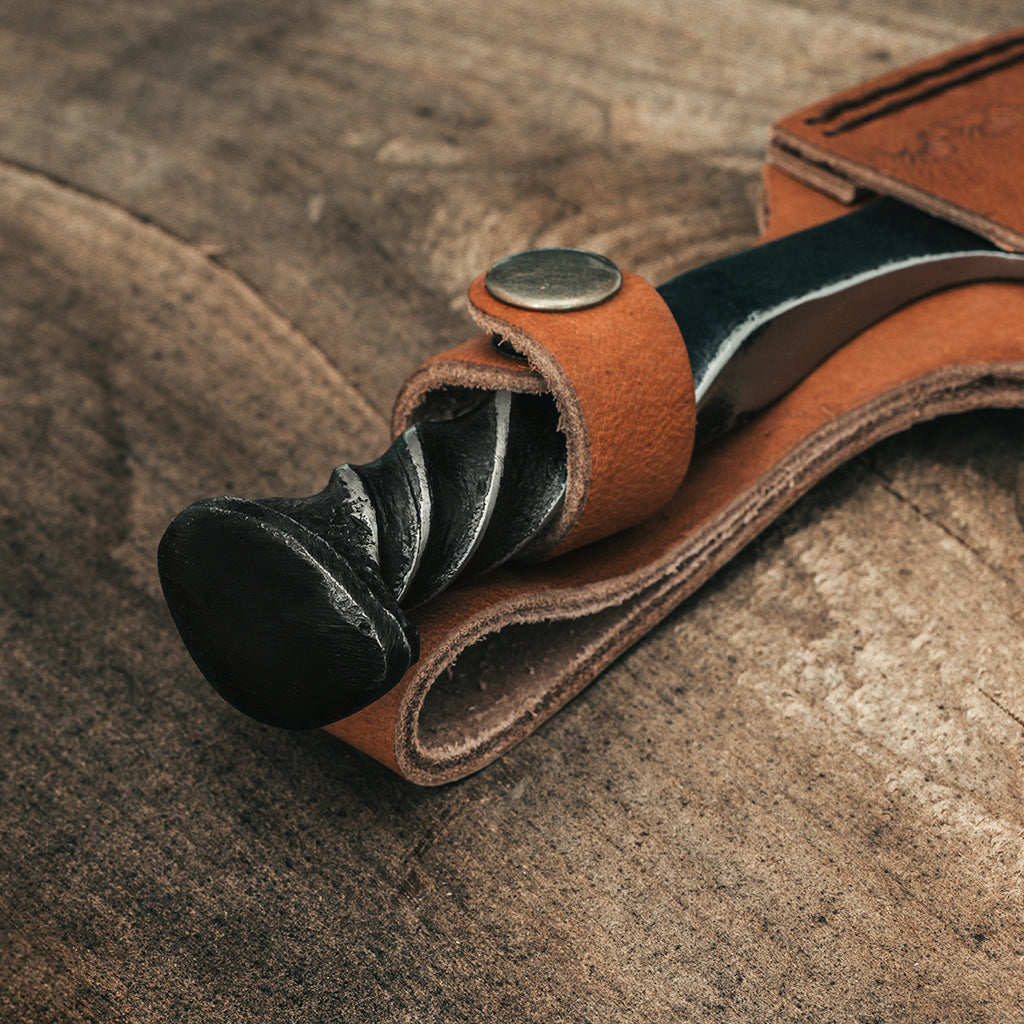 Handgeschmiedetes Rallarmesser mit einer robusten Lederscheide.