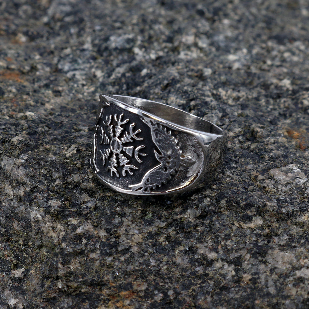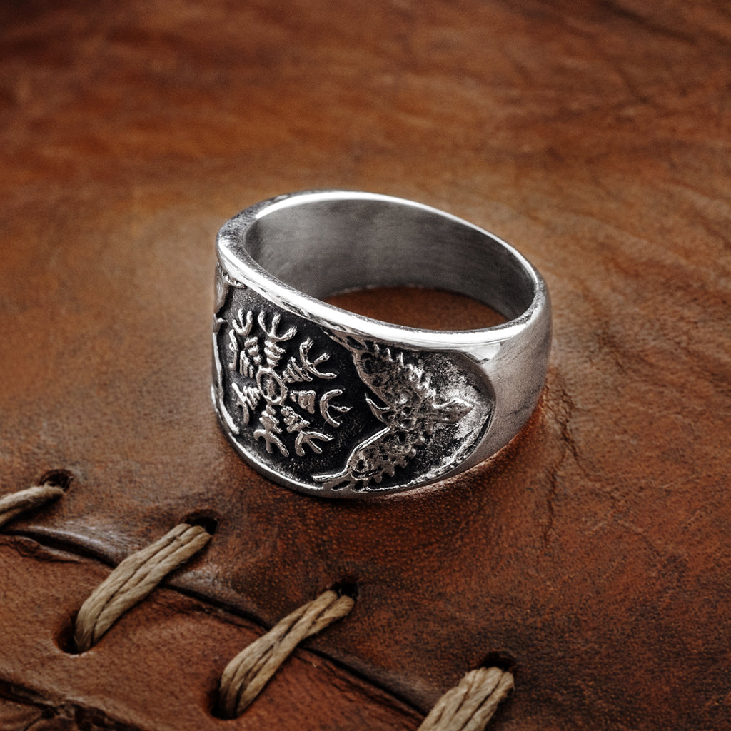 Ein modernes Design, inspiriert von authentischen Wikinger-Artefakten. Er ist aus Edelstahl gefertigt, zeigt das Aegishjálmur-Symbol und ist in den Größen #8 bis #15 erhältlich.