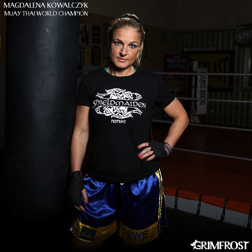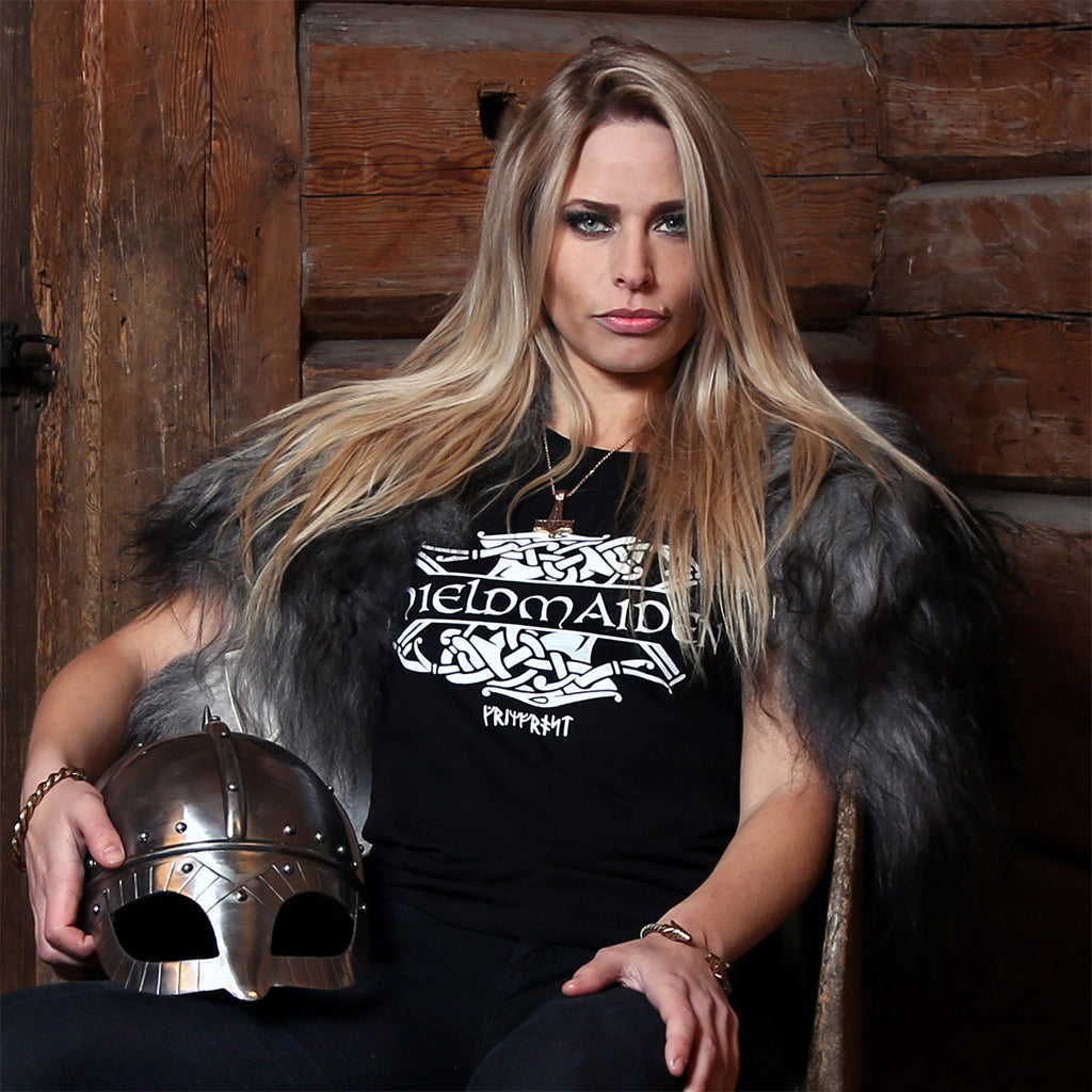Bedruckt mit "Shieldmaiden" und einem Lindwurm-Motiv.