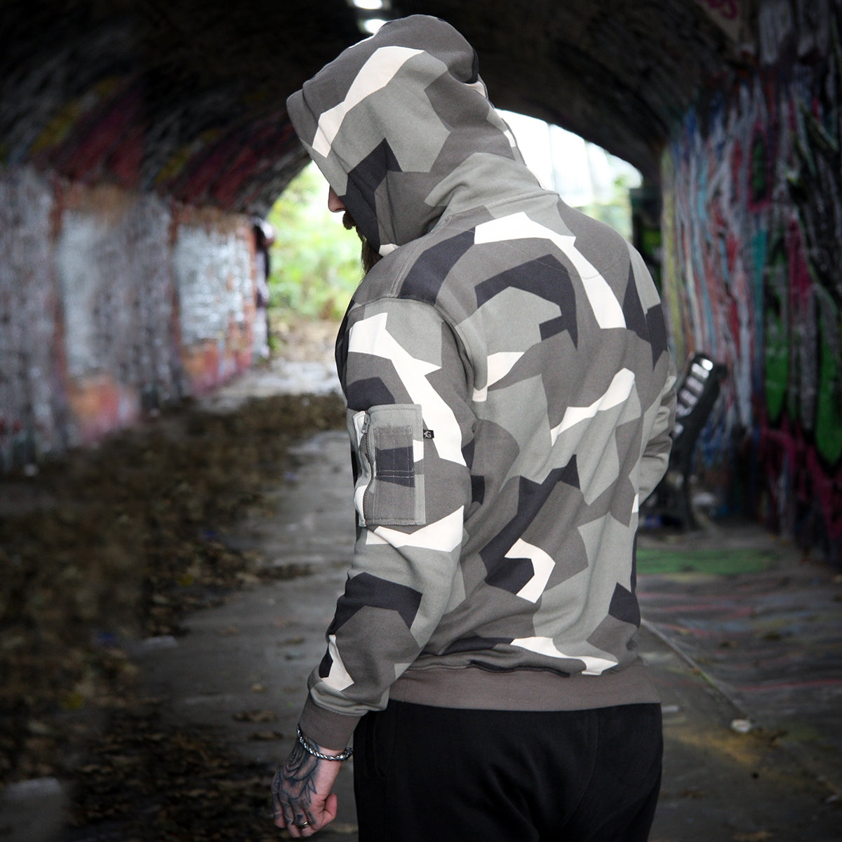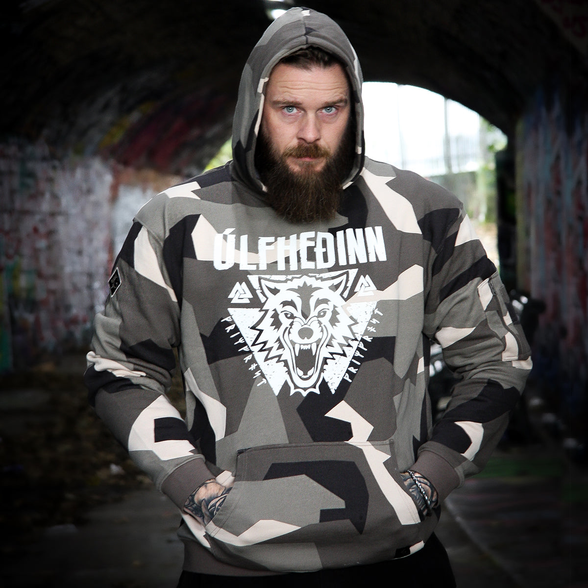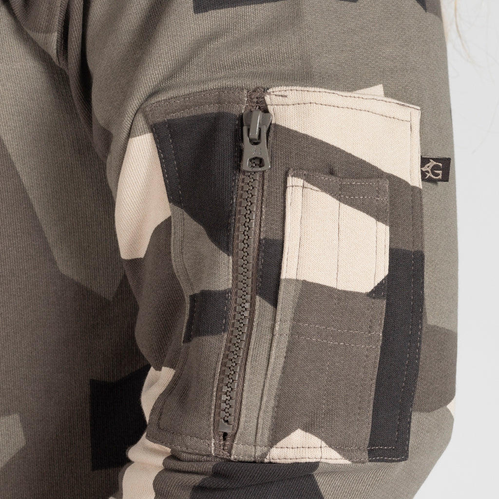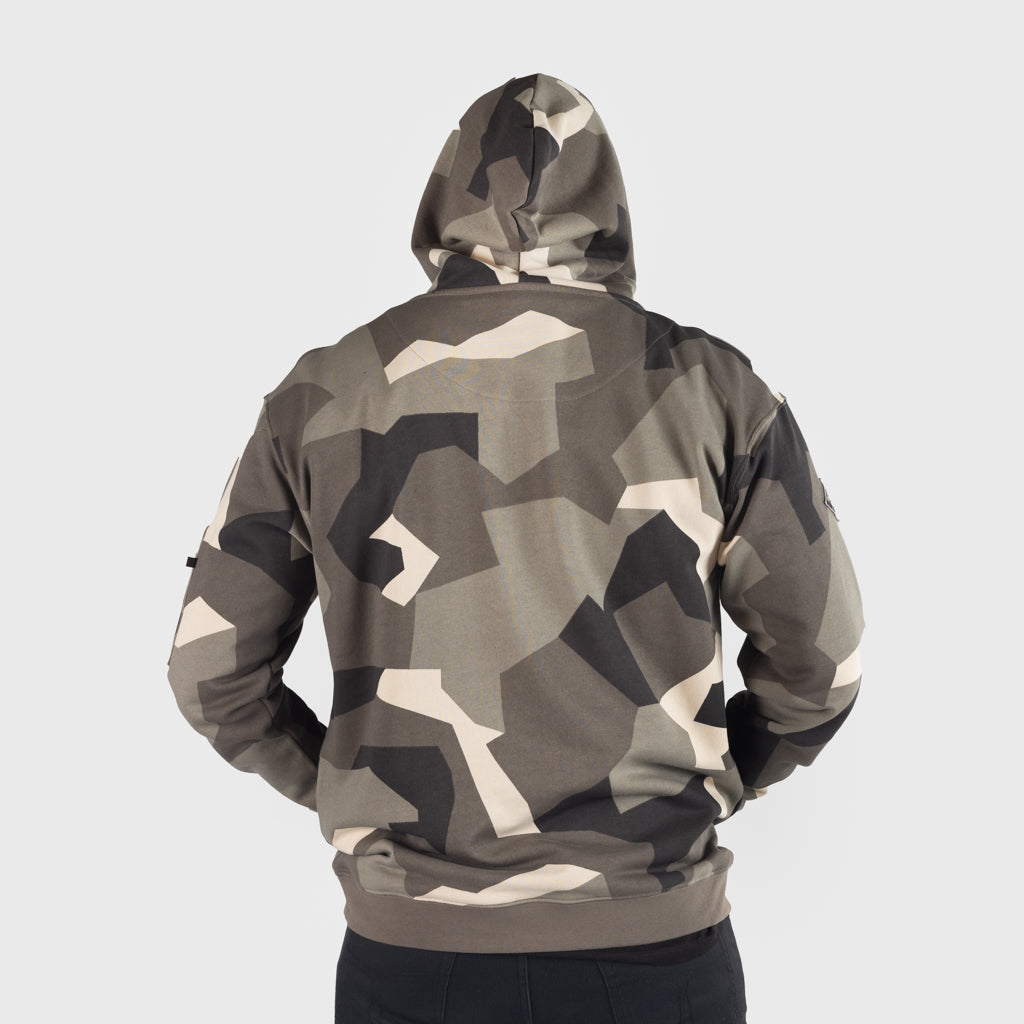 Premium Hoodie im berühmten M90-Tarnmuster der schwedischen Streitkräfte. Er wurde speziell für Grimfrost aus weicher, luxuriöser Bio-Baumwolle hergestellt. Sogar die Färbe- und Druckverfahren sind komplett biologisch, was sowohl für Sie als auch für Mutter Erde gut ist. Der Kapuzenpullover hat eine Reißverschlusstasche am linken Arm und geräumige Kängurutaschen. Um das Ganze abzurunden, haben wir die Ösen des Kordelzugs mit einem Runenkreis des jüngeren Futhark versehen.