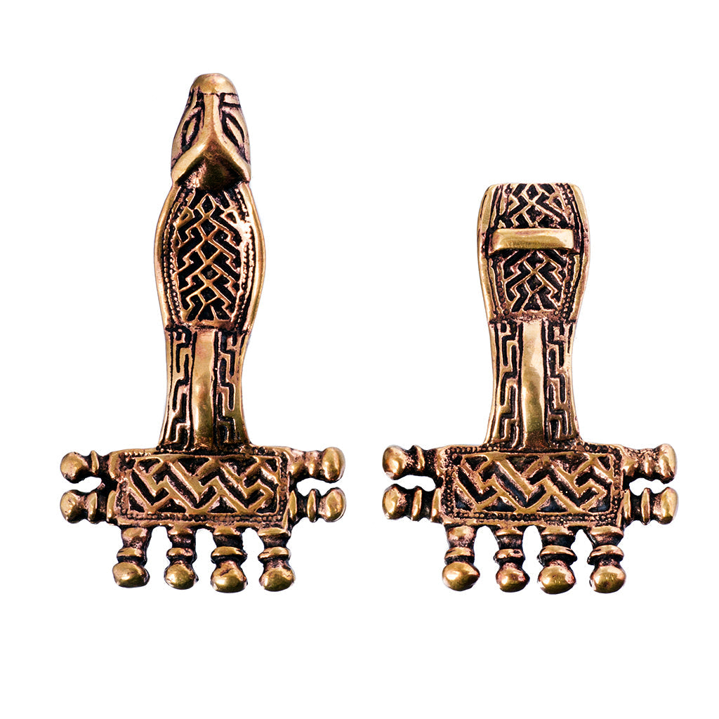 Eine detailreiche und elegante Spangenfibel, wie sie in der Vendelzeit und der Wikingerzeit in Skandinavien üblich war. Die aufwendige Verzierung zeigt den Kopf eines Drachens. Zum Verschließen eines Umhangs oder anderer schwerer Kleidungsstücke geeignet.