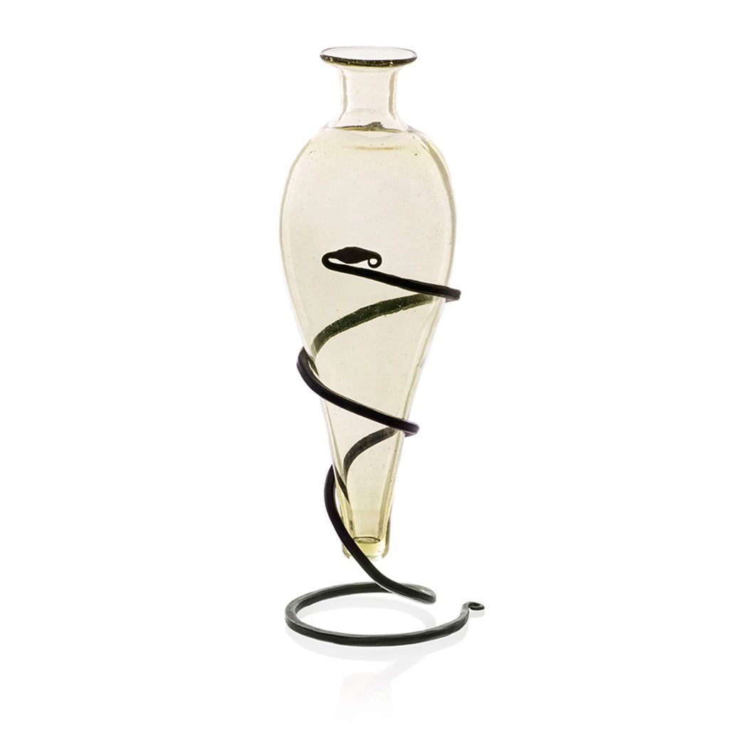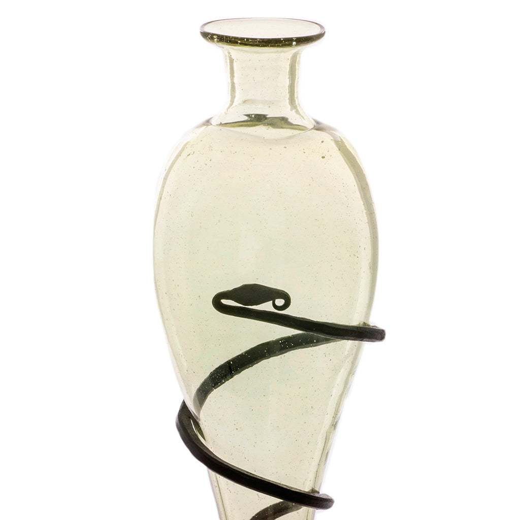 Eine sorgfältig handgefertigte Reproduktion einer wikingerzeitlichen Flasche aus blau-grünlichem Glas.