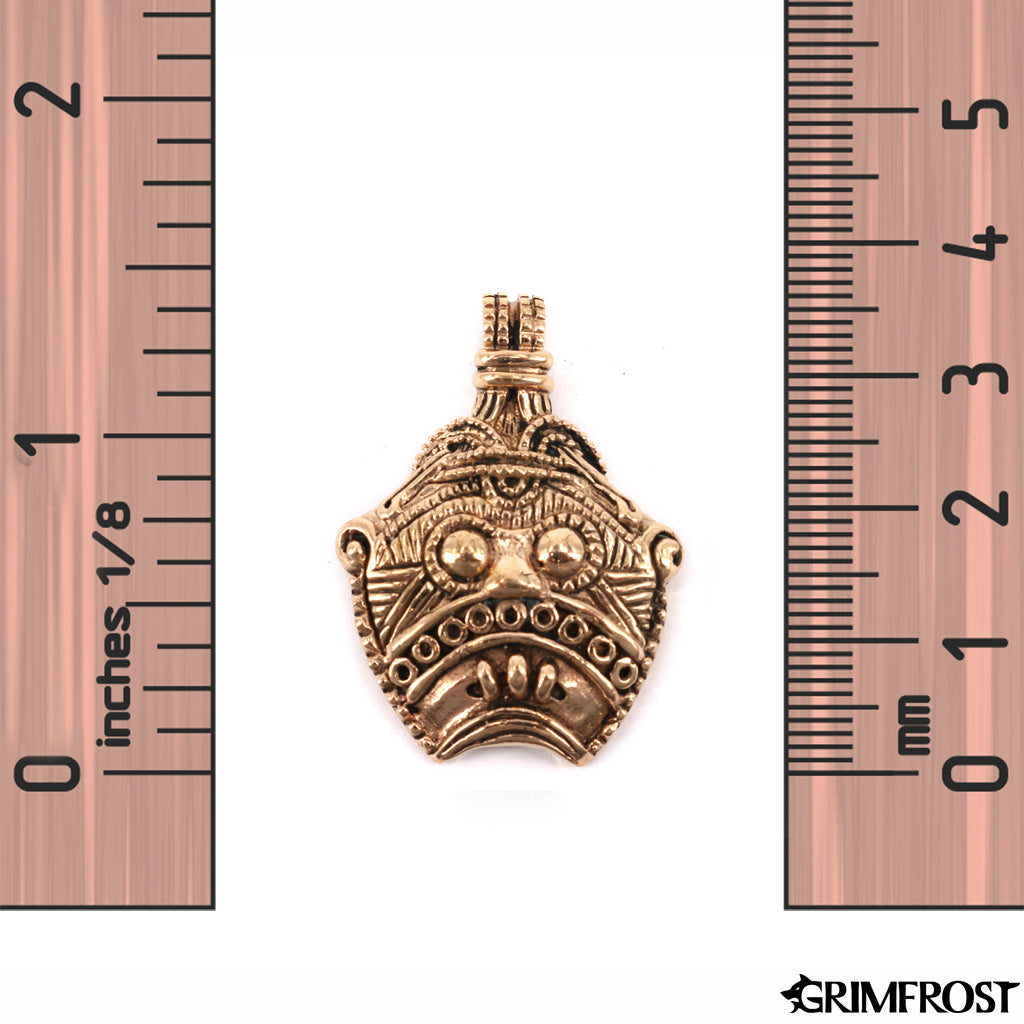 Reproduktion des außergewöhnlichen Fundes aus dem Jahr 2015 in Vejen, Dänemark. Es soll Loki mit zugenähtem Mund darstellen, wie in der nordischen Mythologie beschrieben. Der Originalfund befindet sich heute im Dänischen Nationalmuseum. Das Amulett ist aus massiver Bronze handgefertigt.