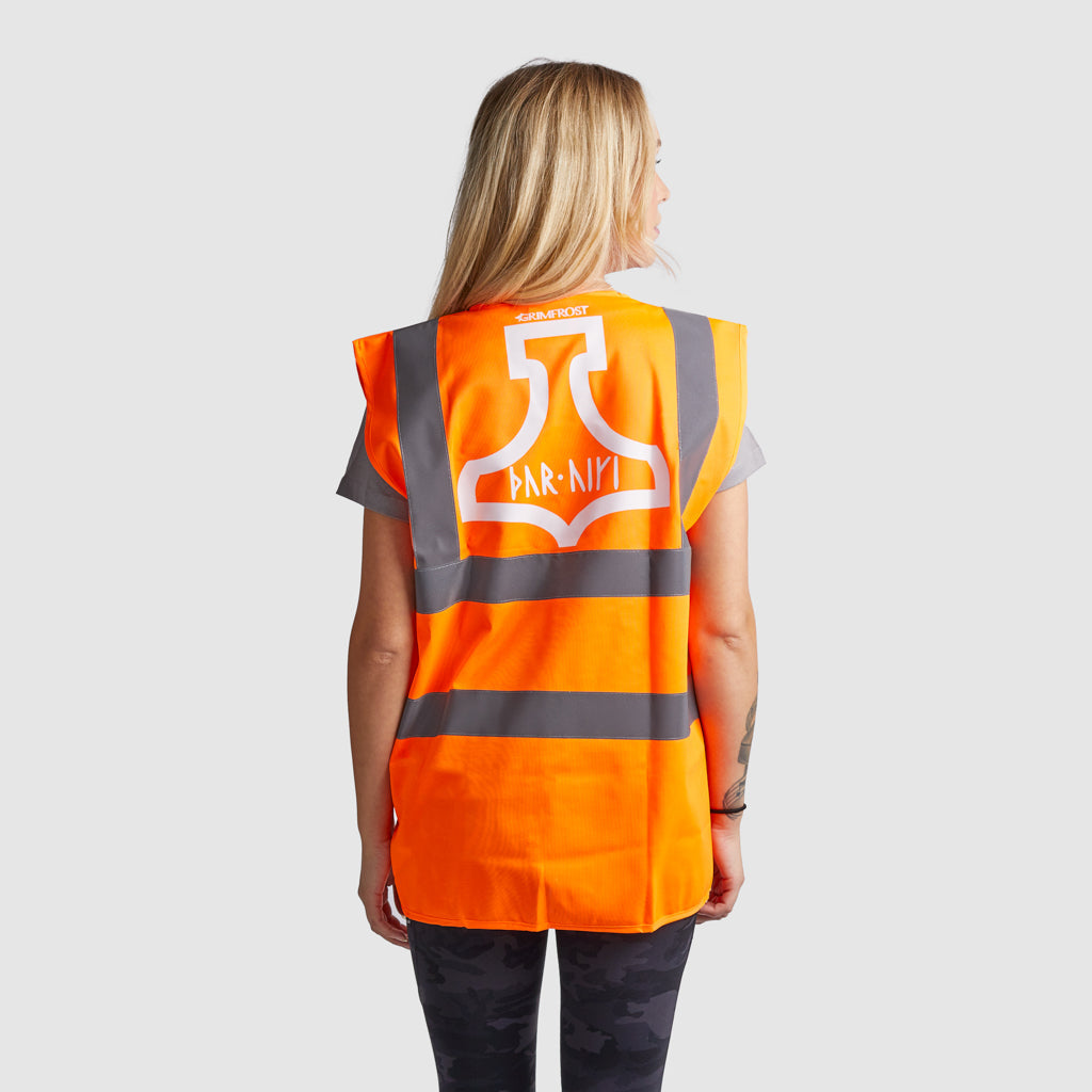 Hochwertige Warnweste für alle Situationen, in denen die Sichtbarkeit entscheidend ist. Auf dem Rücken ist ein Mjölnir-Aufdruck mit dem in Runen geschriebenen "Thor Viki". Das ist eine Schutzformel aus der Wikingerzeit, die aus dem Altnordischen übersetzt "Thor Segne" oder "Thor Beschütze" bedeutet.