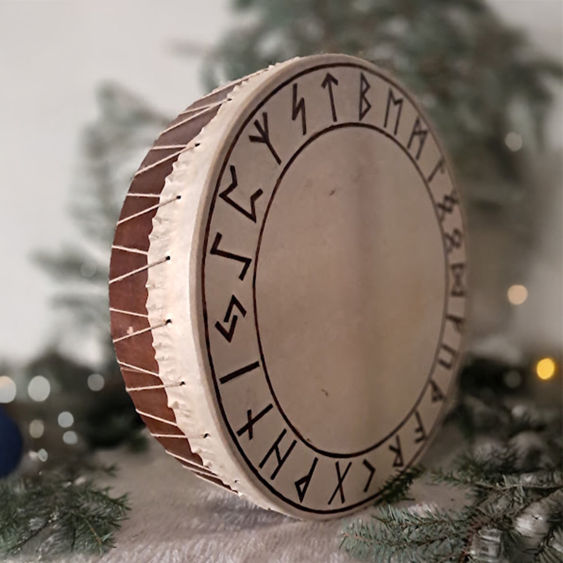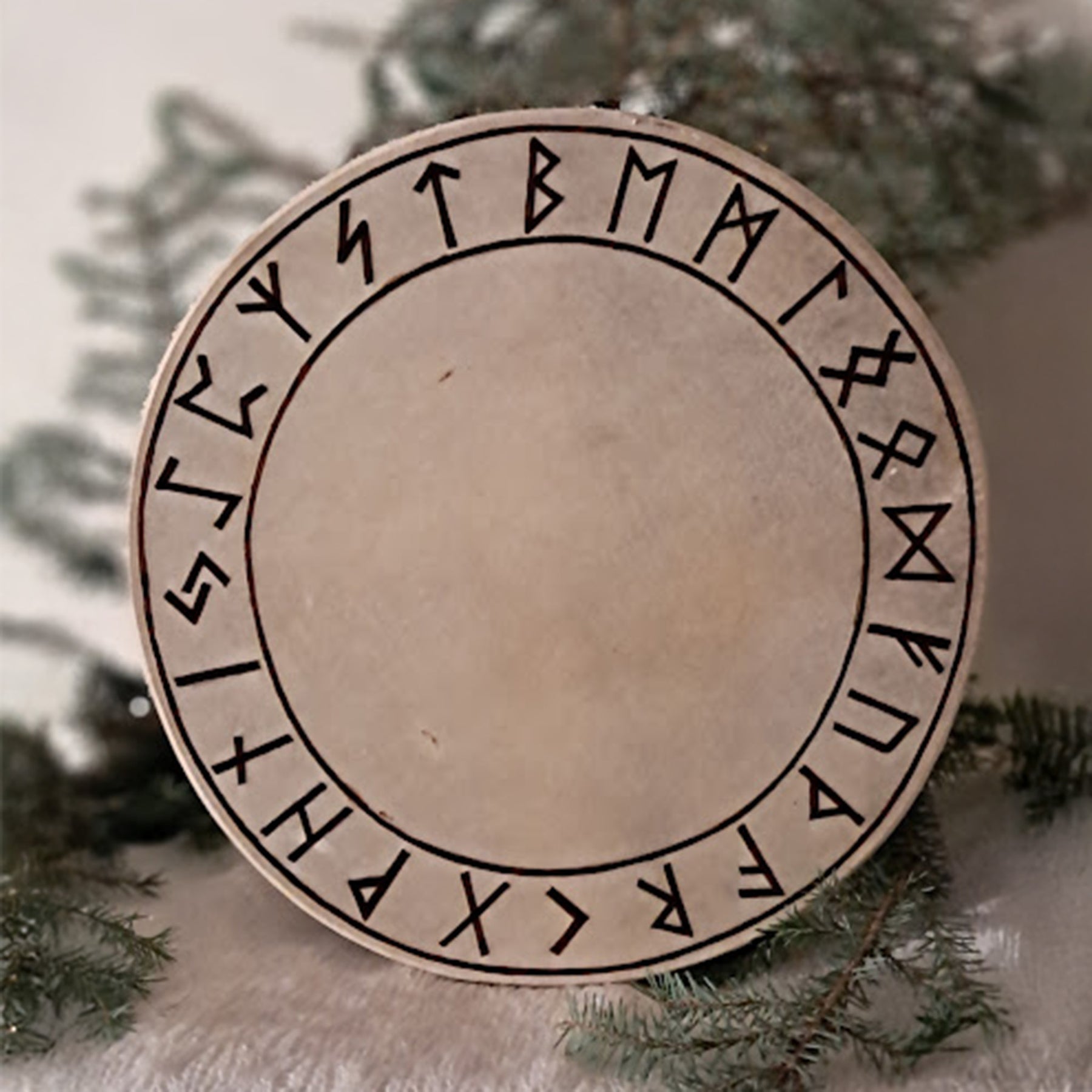Ein Runenkreis aus dem Älteren Futhark ist wunderschön von Hand auf das Trommelfell gemalt. Das Ältere Futhark ist das erste Runensystem und wurde während der Völkerwanderungszeit in ganz Nordeuropa verwendet.
